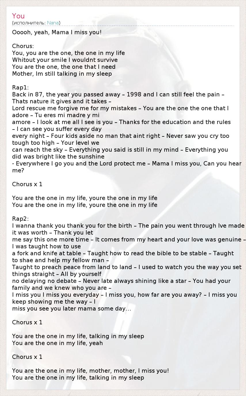 Ooooh, yeah, Mama I miss you! Chorus: You, you are the one, the one in my life Whitout your smile I wouldnt survive You are the one, the one that I need Mother, Im still talking in my sleep Rap1: Back in 87, the year you passed away – 1998 and I can still feel the pain – Thats nature it gives and it takes – Lord rescue me forgive me for my mistakes – You are the one the one that I adore – Tu eres mi madre y mi amore – I look at me all I see is you – Thanks for the education and the rules – I can see you suffer every day every night – Four kids aside no man that aint right – Never saw you cry too tough too high – Your level we can reach the sky – Everything you said is still in my mind – Everything you did was bright like the sunshine - Everywhere I go you and the Lord protect me – Mama I miss you, Can you hear me? Chorus x 1 You are the one in my life, youre the one in my life You are the one in my life, youre the one in my life Rap2: I wanna thank you thank you for the birth – The pain you went through Ive made it was worth – Thank you let me say this one more time – It comes from my heart and your love was genuine – I was taught how to use a fork and knife at table – Taught how to read the bible to be stable – Taught to shae and help my fellow man – Taught to preach peace from land to land – I used to watch you the way you set things straight – All by yourself no delaying no debate – Never late always shining like a star – You had your family and we knew who you are – I miss you I miss you everyday – I miss you, how far are you away? – I miss you keep showing me the way – I miss you see you later mama some day… Chorus x 1 You are the one in my life, talking in my sleep You are the one in my life, yeah Chorus x 1 You are the one in my life, mother, mother, I miss you! You are the one in my life, talking in my sleep
