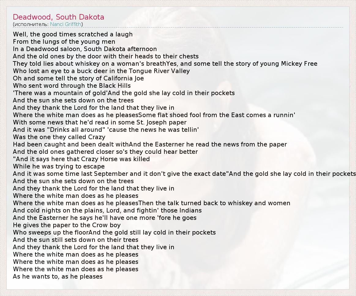 А как ты думаешь, о чем песня "Deadwood, South Dakota" ?