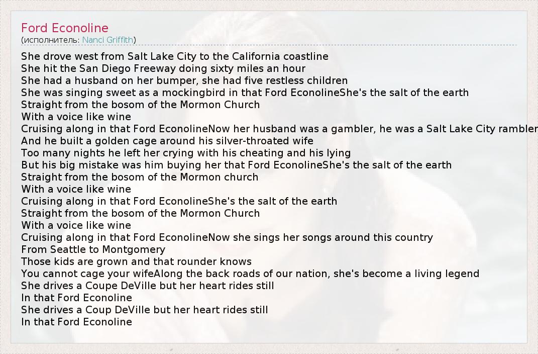 She drove west from Salt Lake City to the California coastline She hit the San Diego Freeway doing sixty miles an hour She had a husband on her bumper, she had five restless children She was singing sweet as a mockingbird in that Ford EconolineShe's the salt of the earth Straight from the bosom of the Mormon Church With a voice like wine Cruising along in that Ford EconolineNow her husband was a gambler, he was a Salt Lake City rambler And he built a golden cage around his silver-throated wife Too many nights he left her crying with his cheating and his lying But his big mistake was him buying her that Ford EconolineShe's the salt of the earth Straight from the bosom of the Mormon church With a voice like wine Cruising along in that Ford EconolineShe's the salt of the earth Straight from the bosom of the Mormon Church With a voice like wine Cruising along in that Ford EconolineNow she sings her songs around this country From Seattle to Montgomery Those kids are grown and that rounder knows You cannot cage your wifeAlong the back roads of our nation, she's become a living legend She drives a Coupe DeVille but her heart rides still In that Ford Econoline She drives a Coup DeVille but her heart rides still In that Ford Econoline