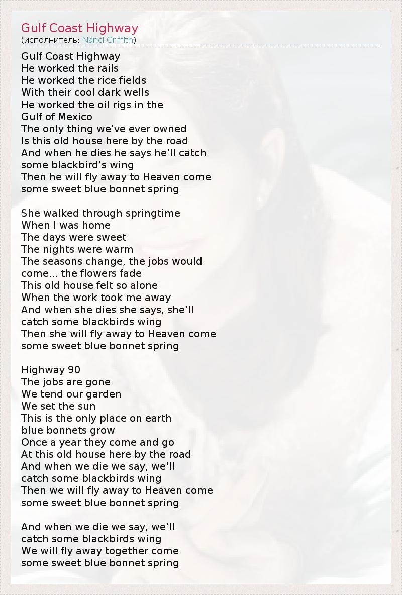 Gulf Coast Highway He worked the rails He worked the rice fields With their cool dark wells He worked the oil rigs in the Gulf of Mexico The only thing we've ever owned Is this old house here by the road And when he dies he says he'll catch some blackbird's wing Then he will fly away to Heaven come some sweet blue bonnet spring She walked through springtime When I was home The days were sweet The nights were warm The seasons change, the jobs would come... the flowers fade This old house felt so alone When the work took me away And when she dies she says, she'll catch some blackbirds wing Then she will fly away to Heaven come some sweet blue bonnet spring Highway 90 The jobs are gone We tend our garden We set the sun This is the only place on earth blue bonnets grow Once a year they come and go At this old house here by the road And when we die we say, we'll catch some blackbirds wing Then we will fly away to Heaven come some sweet blue bonnet spring And when we die we say, we'll catch some blackbirds wing We will fly away together come some sweet blue bonnet spring