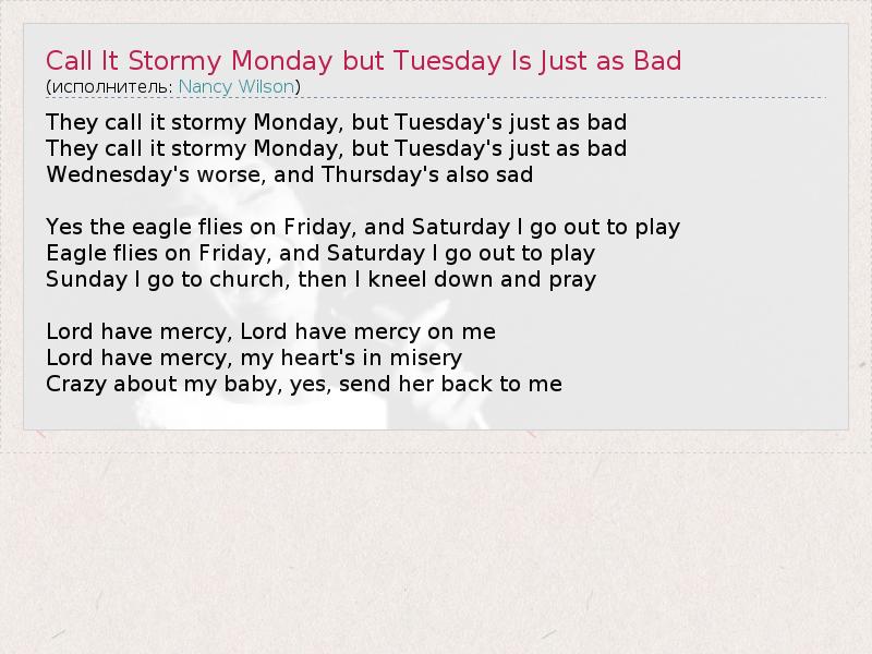А как ты думаешь, о чем песня "Call It Stormy Monday but Tuesday Is Just as Bad" ?
