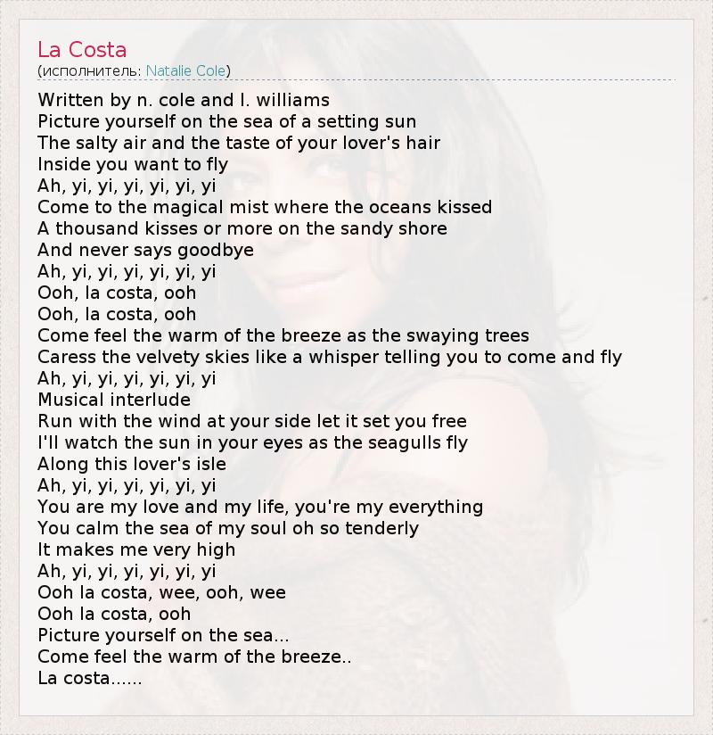 Written by n. cole and l. williams Picture yourself on the sea of a setting sun The salty air and the taste of your lover's hair Inside you want to fly Ah, yi, yi, yi, yi, yi, yi Come to the magical mist where the oceans kissed A thousand kisses or more on the sandy shore And never says goodbye Ah, yi, yi, yi, yi, yi, yi Ooh, la costa, ooh Ooh, la costa, ooh Come feel the warm of the breeze as the swaying trees Caress the velvety skies like a whisper telling you to come and fly Ah, yi, yi, yi, yi, yi, yi Musical interlude Run with the wind at your side let it set you free I'll watch the sun in your eyes as the seagulls fly Along this lover's isle Ah, yi, yi, yi, yi, yi, yi You are my love and my life, you're my everything You calm the sea of my soul oh so tenderly It makes me very high Ah, yi, yi, yi, yi, yi, yi Ooh la costa, wee, ooh, wee Ooh la costa, ooh Picture yourself on the sea... Come feel the warm of the breeze.. La costa......