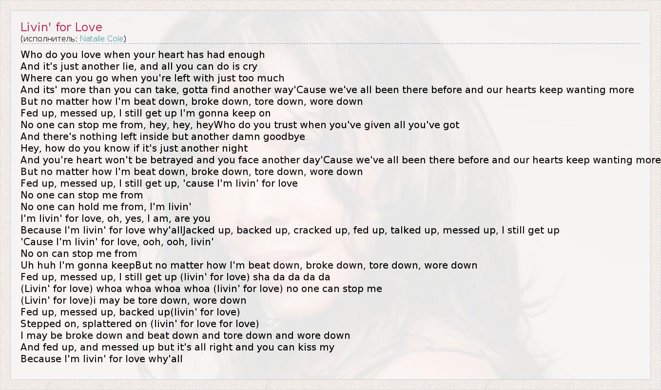 Because I'm livin' for love why'allJacked up, backed up, cracked up, fed up, talked up, messed up, I still get up