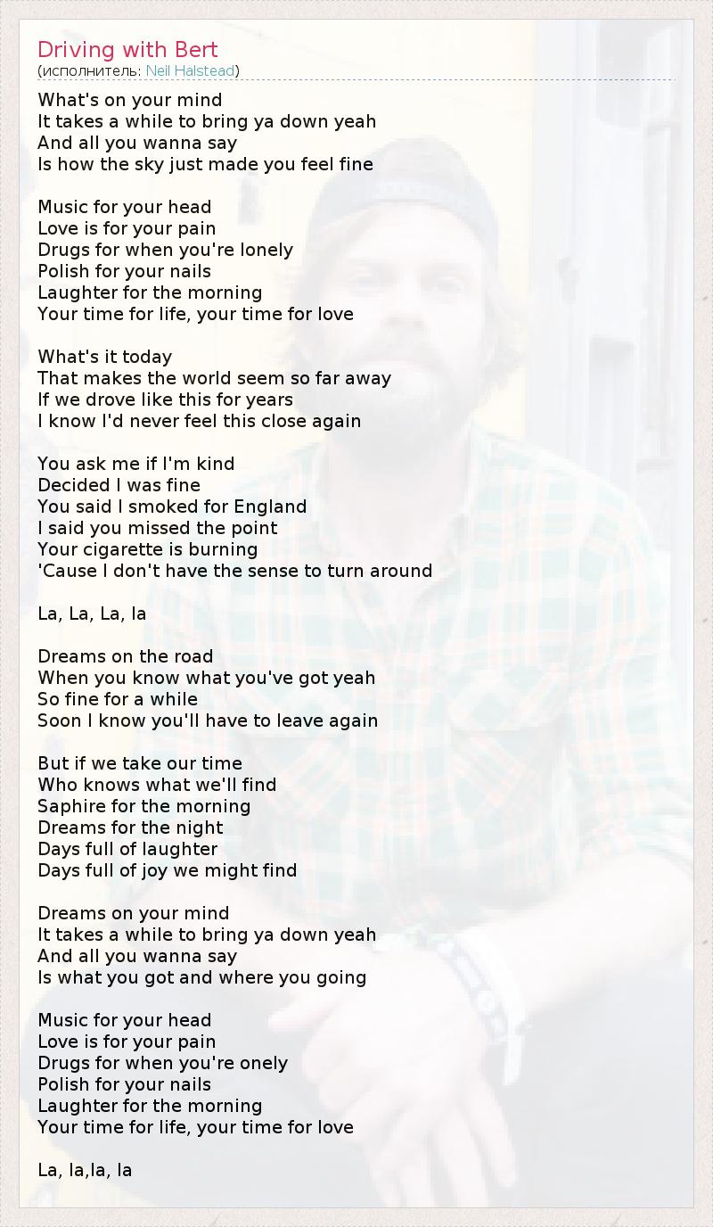 What's on your mind It takes a while to bring ya down yeah And all you wanna say Is how the sky just made you feel fine Music for your head Love is for your pain Drugs for when you're lonely Polish for your nails Laughter for the morning Your time for life, your time for love What's it today That makes the world seem so far away If we drove like this for years I know I'd never feel this close again You ask me if I'm kind Decided I was fine You said I smoked for England I said you missed the point Your cigarette is burning 'Cause I don't have the sense to turn around La, La, La, la Dreams on the road When you know what you've got yeah So fine for a while Soon I know you'll have to leave again But if we take our time Who knows what we'll find Saphire for the morning Dreams for the night Days full of laughter Days full of joy we might find Dreams on your mind It takes a while to bring ya down yeah And all you wanna say Is what you got and where you going Music for your head Love is for your pain Drugs for when you're onely Polish for your nails Laughter for the morning Your time for life, your time for love La, la,la, la