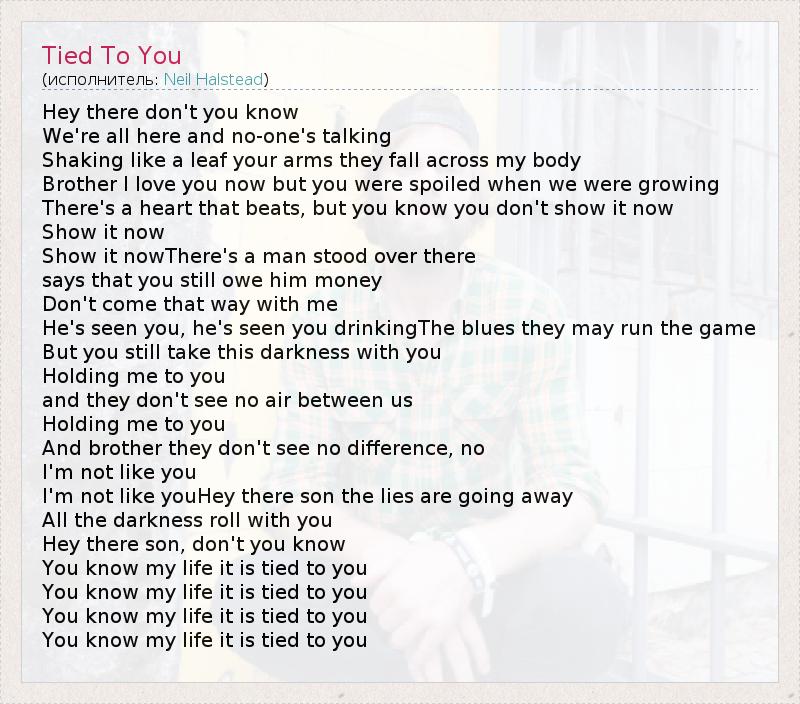 Hey there don't you know We're all here and no-one's talking Shaking like a leaf your arms they fall across my body Brother I love you now but you were spoiled when we were growing There's a heart that beats, but you know you don't show it now Show it now Show it nowThere's a man stood over there says that you still owe him money Don't come that way with me He's seen you, he's seen you drinkingThe blues they may run the game But you still take this darkness with you Holding me to you and they don't see no air between us Holding me to you And brother they don't see no difference, no I'm not like you I'm not like youHey there son the lies are going away All the darkness roll with you Hey there son, don't you know You know my life it is tied to you You know my life it is tied to you You know my life it is tied to you You know my life it is tied to you