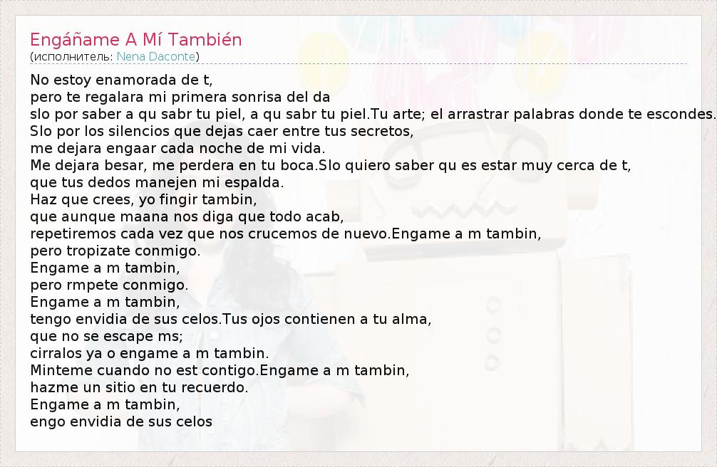 No estoy enamorada de t, pero te regalara mi primera sonrisa del da slo por saber a qu sabr tu piel, a qu sabr tu piel.Tu arte; el arrastrar palabras donde te escondes. Slo por los silencios que dejas caer entre tus secretos, me dejara engaar cada noche de mi vida. Me dejara besar, me perdera en tu boca.Slo quiero saber qu es estar muy cerca de t, que tus dedos manejen mi espalda. Haz que crees, yo fingir tambin, que aunque maana nos diga que todo acab, repetiremos cada vez que nos crucemos de nuevo.Engame a m tambin, pero tropizate conmigo. Engame a m tambin, pero rmpete conmigo. Engame a m tambin, tengo envidia de sus celos.Tus ojos contienen a tu alma, que no se escape ms; cirralos ya o engame a m tambin. Minteme cuando no est contigo.Engame a m tambin, hazme un sitio en tu recuerdo. Engame a m tambin, engo envidia de sus celos