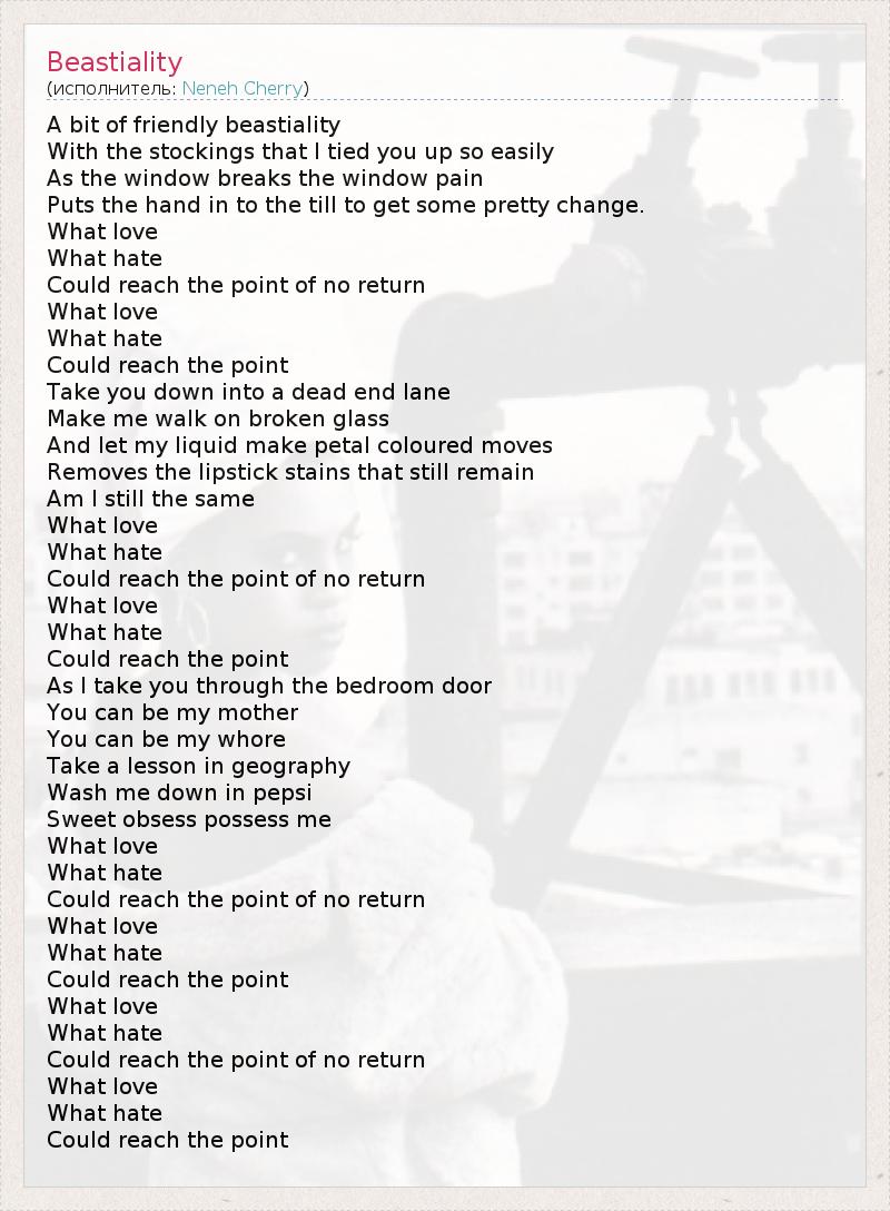 A bit of friendly beastiality With the stockings that I tied you up so easily As the window breaks the window pain Puts the hand in to the till to get some pretty change. What love What hate Could reach the point of no return What love What hate Could reach the point Take you down into a dead end lane Make me walk on broken glass And let my liquid make petal coloured moves Removes the lipstick stains that still remain Am I still the same What love What hate Could reach the point of no return What love What hate Could reach the point As I take you through the bedroom door You can be my mother You can be my whore Take a lesson in geography Wash me down in pepsi Sweet obsess possess me What love What hate Could reach the point of no return What love What hate Could reach the point What love What hate Could reach the point of no return What love What hate Could reach the point