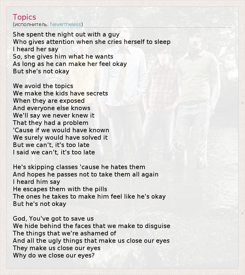 She spent the night out with a guy Who gives attention when she cries herself to sleep I heard her say So, she gives him what he wants As long as he can make her feel okay But she's not okay We avoid the topics We make the kids have secrets When they are exposed And everyone else knows We'll say we never knew it That they had a problem 'Cause if we would have known We surely would have solved it But we can't, it's too late I said we can't, it's too late He's skipping classes 'cause he hates them And hopes he passes not to take them all again I heard him say He escapes them with the pills The ones he takes to make him feel like he's okay But he's not okay God, You've got to save us We hide behind the faces that we make to disguise The things that we're ashamed of And all the ugly things that make us close our eyes They make us close our eyes Why do we close our eyes?