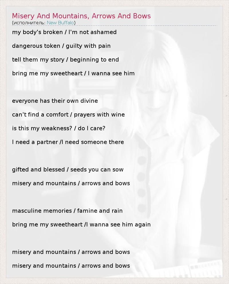 my body's broken / I'm not ashamed dangerous token / guilty with pain tell them my story / beginning to end bring me my sweetheart / I wanna see him everyone has their own divine can't find a comfort / prayers with wine is this my weakness? / do I care? I need a partner /I need someone there gifted and blessed / seeds you can sow misery and mountains / arrows and bows masculine memories / famine and rain bring me my sweetheart /I wanna see him again misery and mountains / arrows and bows misery and mountains / arrows and bows