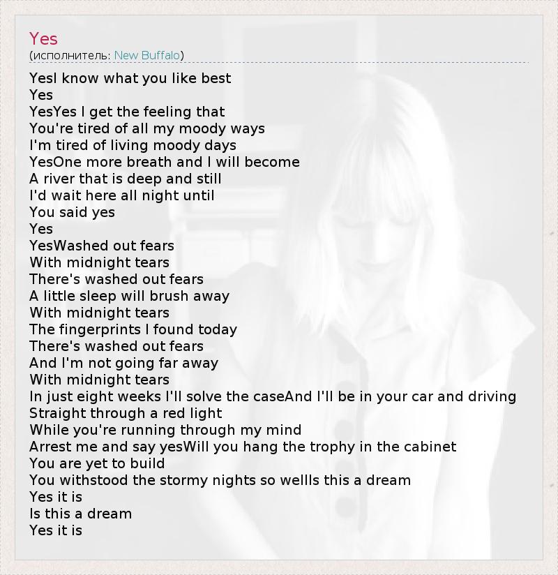 YesI know what you like best Yes YesYes I get the feeling that You're tired of all my moody ways I'm tired of living moody days YesOne more breath and I will become A river that is deep and still I'd wait here all night until You said yes Yes YesWashed out fears With midnight tears There's washed out fears A little sleep will brush away With midnight tears The fingerprints I found today There's washed out fears And I'm not going far away With midnight tears In just eight weeks I'll solve the caseAnd I'll be in your car and driving Straight through a red light While you're running through my mind Arrest me and say yesWill you hang the trophy in the cabinet You are yet to build You withstood the stormy nights so wellIs this a dream Yes it is Is this a dream Yes it is