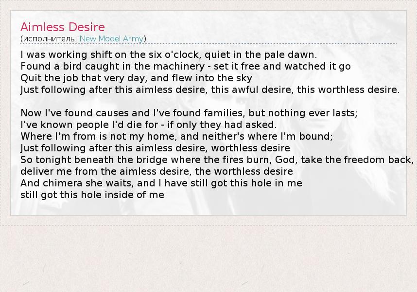 А как ты думаешь, о чем песня "Aimless Desire" ?