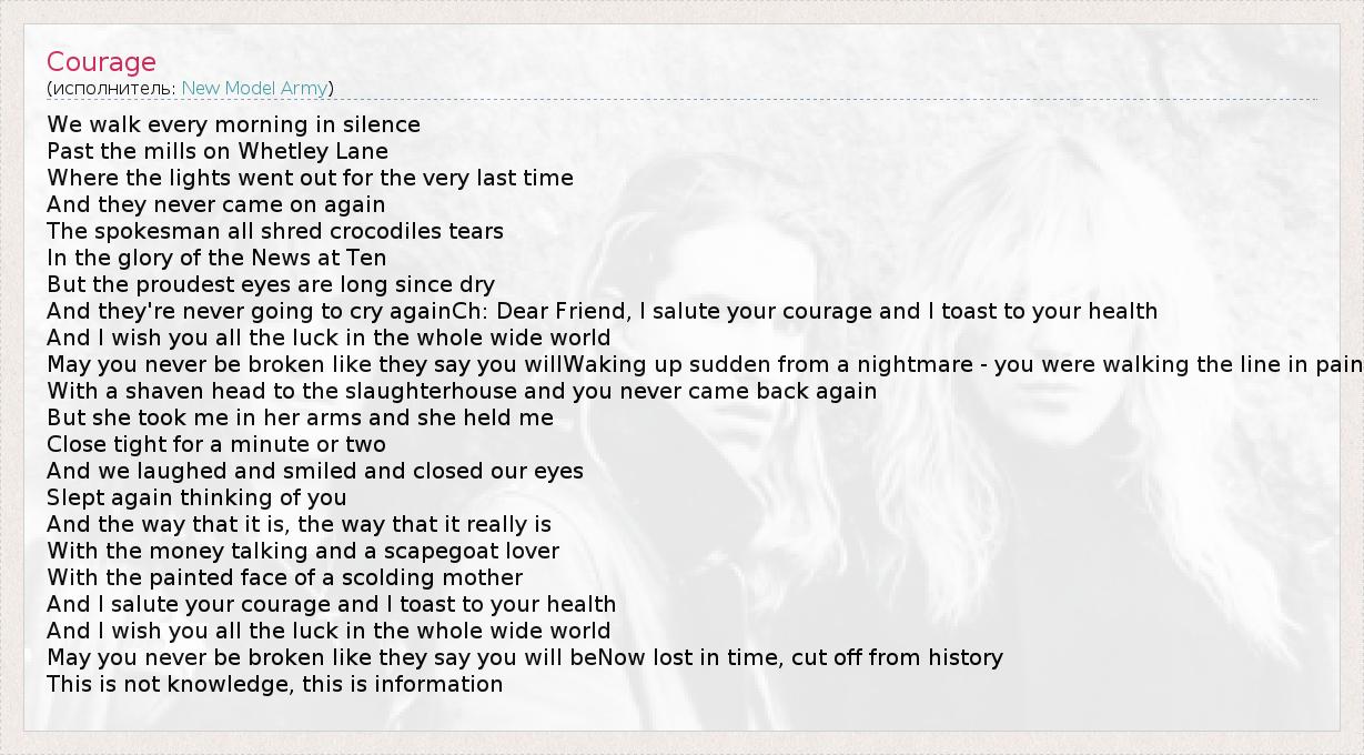 We walk every morning in silence Past the mills on Whetley Lane Where the lights went out for the very last time And they never came on again The spokesman all shred crocodiles tears In the glory of the News at Ten But the proudest eyes are long since dry And they're never going to cry againCh: Dear Friend, I salute your courage and I toast to your health And I wish you all the luck in the whole wide world May you never be broken like they say you willWaking up sudden from a nightmare - you were walking the line in pain With a shaven head to the slaughterhouse and you never came back again But she took me in her arms and she held me Close tight for a minute or two And we laughed and smiled and closed our eyes Slept again thinking of you And the way that it is, the way that it really is With the money talking and a scapegoat lover With the painted face of a scolding mother And I salute your courage and I toast to your health And I wish you all the luck in the whole wide world May you never be broken like they say you will beNow lost in time, cut off from history This is not knowledge, this is information