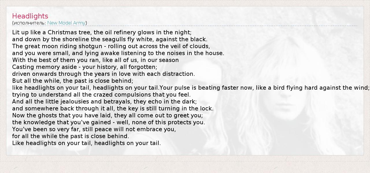 Lit up like a Christmas tree, the oil refinery glows in the night; and down by the shoreline the seagulls fly white, against the black. The great moon riding shotgun - rolling out across the veil of clouds, and you were small, and lying awake listening to the noises in the house. With the best of them you ran, like all of us, in our season Casting memory aside - your history, all forgotten; driven onwards through the years in love with each distraction. But all the while, the past is close behind; like headlights on your tail, headlights on your tail.Your pulse is beating faster now, like a bird flying hard against the wind; trying to understand all the crazed compulsions that you feel. And all the little jealousies and betrayals, they echo in the dark; and somewhere back through it all, the key is still turning in the lock. Now the ghosts that you have laid, they all come out to greet you; the knowledge that you've gained - well, none of this protects you. You've been so very far, still peace will not embrace you, for all the while the past is close behind. Like headlights on your tail, headlights on your tail.