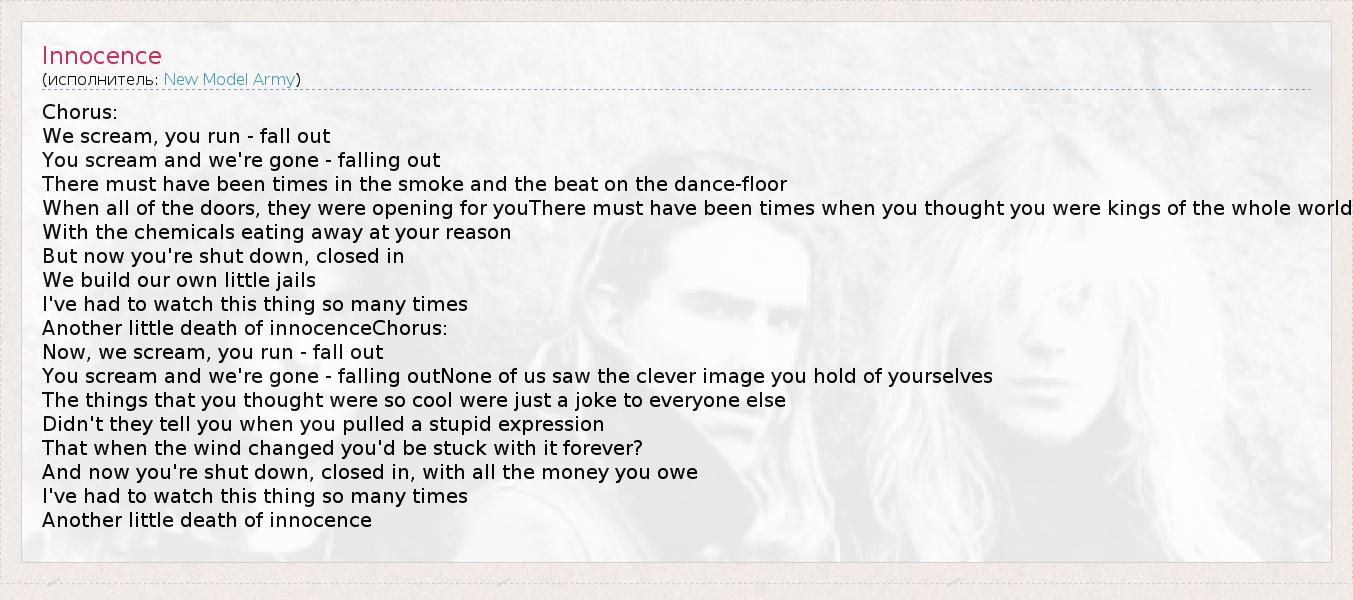 Это интересно:1980—1989New Model Army (заимствовавшие название у военной организации под предводительством Оливера Кромвеля) образовались в Брэдфорде, графство Йоркшир, в 1980 году под предводительством поющего гитариста Слэйда-Уравнителя (Slade The Leveller, он же Джастин Салливан, родился 8 апреля 1956 года в Букингемшире, Англия). Соавтором идеи можно считать его подругу, писательницу и поэтессу Джулз Денби (Joolz... продолжение