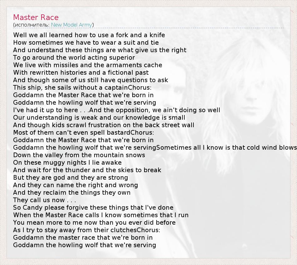 Well we all learned how to use a fork and a knife How sometimes we have to wear a suit and tie And understand these things are what give us the right To go around the world acting superior We live with missiles and the armaments cache With rewritten histories and a fictional past And though some of us still have questions to ask This ship, she sails without a captainChorus: Goddamn the Master Race that we're born in Goddamn the howling wolf that we're serving I've had it up to here . . .And the opposition, we ain't doing so well Our understanding is weak and our knowledge is small And though kids scrawl frustration on the back street wall Most of them can't even spell bastardChorus: Goddamn the Master Race that we're born in Goddamn the howling wolf that we're servingSometimes all I know is that cold wind blows Down the valley from the mountain snows On these muggy nights I lie awake And wait for the thunder and the skies to break But they are god and they are strong And they can name the right and wrong And they reclaim the things they own They call us now . . . So Candy please forgive these things that I've done When the Master Race calls I know sometimes that I run You mean more to me now than you ever did before As I try to stay away from their clutchesChorus: Goddamn the master race that we're born in Goddamn the howling wolf that we're serving