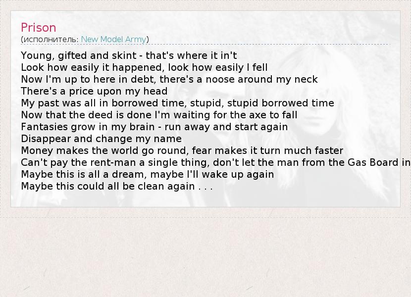 Young, gifted and skint - that's where it in't Look how easily it happened, look how easily I fell Now I'm up to here in debt, there's a noose around my neck There's a price upon my head My past was all in borrowed time, stupid, stupid borrowed time Now that the deed is done I'm waiting for the axe to fall Fantasies grow in my brain - run away and start again Disappear and change my name Money makes the world go round, fear makes it turn much faster Can't pay the rent-man a single thing, don't let the man from the Gas Board in Maybe this is all a dream, maybe I'll wake up again Maybe this could all be clean again . . .