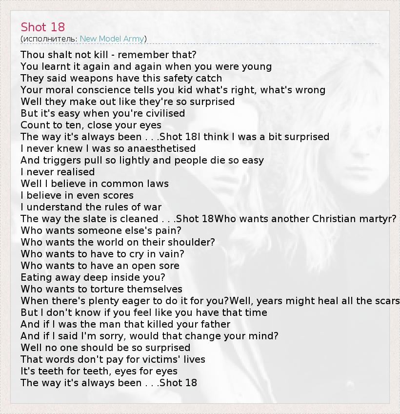 Thou shalt not kill - remember that? You learnt it again and again when you were young They said weapons have this safety catch Your moral conscience tells you kid what's right, what's wrong Well they make out like they're so surprised But it's easy when you're civilised Count to ten, close your eyes The way it's always been . . .Shot 18I think I was a bit surprised I never knew I was so anaesthetised And triggers pull so lightly and people die so easy I never realised Well I believe in common laws I believe in even scores I understand the rules of war The way the slate is cleaned . . .Shot 18Who wants another Christian martyr? Who wants someone else's pain? Who wants the world on their shoulder? Who wants to have to cry in vain? Who wants to have an open sore Eating away deep inside you? Who wants to torture themselves When there's plenty eager to do it for you?Well, years might heal all the scars But I don't know if you feel like you have that time And if I was the man that killed your father And if I said I'm sorry, would that change your mind? Well no one should be so surprised That words don't pay for victims' lives It's teeth for teeth, eyes for eyes The way it's always been . . .Shot 18