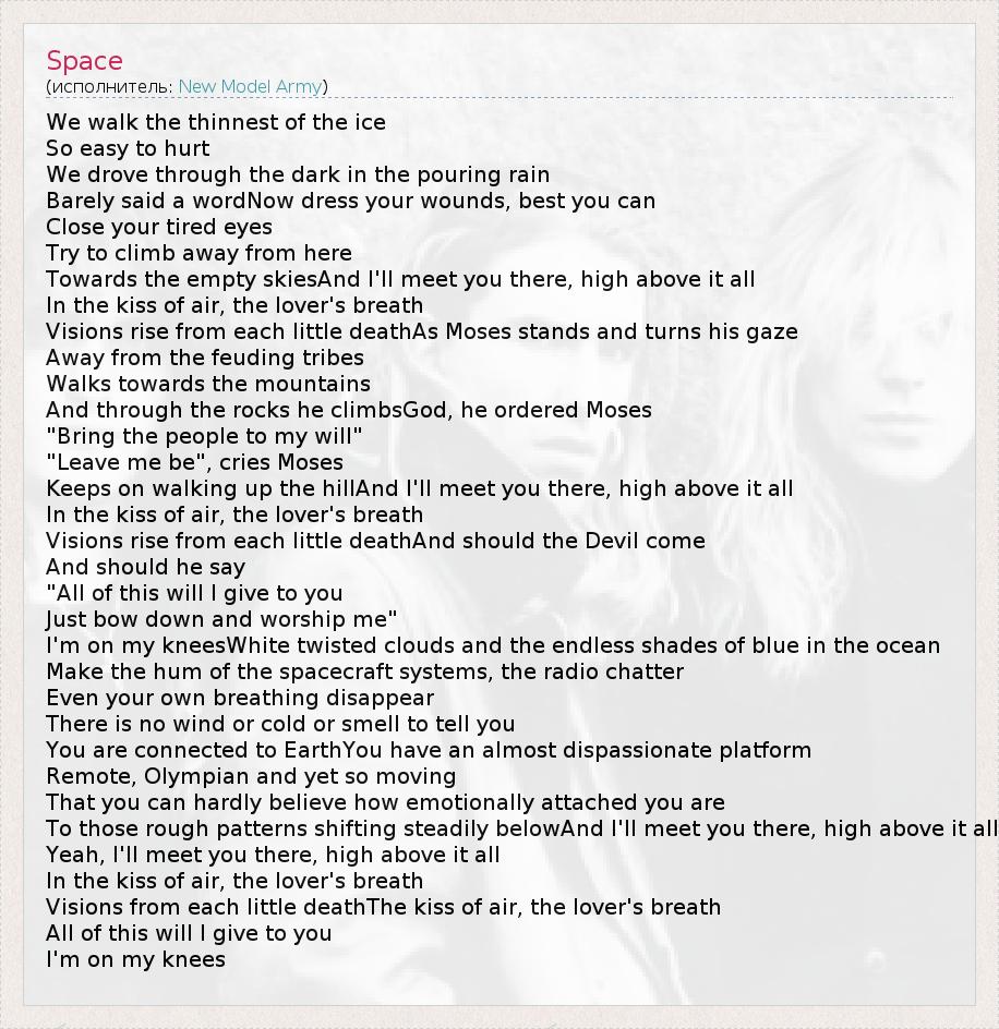 We walk the thinnest of the ice So easy to hurt We drove through the dark in the pouring rain Barely said a wordNow dress your wounds, best you can Close your tired eyes Try to climb away from here Towards the empty skiesAnd I'll meet you there, high above it all In the kiss of air, the lover's breath Visions rise from each little deathAs Moses stands and turns his gaze Away from the feuding tribes Walks towards the mountains And through the rocks he climbsGod, he ordered Moses "Bring the people to my will" "Leave me be", cries Moses Keeps on walking up the hillAnd I'll meet you there, high above it all In the kiss of air, the lover's breath Visions rise from each little deathAnd should the Devil come And should he say "All of this will I give to you Just bow down and worship me" I'm on my kneesWhite twisted clouds and the endless shades of blue in the ocean Make the hum of the spacecraft systems, the radio chatter Even your own breathing disappear There is no wind or cold or smell to tell you You are connected to EarthYou have an almost dispassionate platform Remote, Olympian and yet so moving That you can hardly believe how emotionally attached you are To those rough patterns shifting steadily belowAnd I'll meet you there, high above it all Yeah, I'll meet you there, high above it all In the kiss of air, the lover's breath Visions from each little deathThe kiss of air, the lover's breath All of this will I give to you I'm on my knees