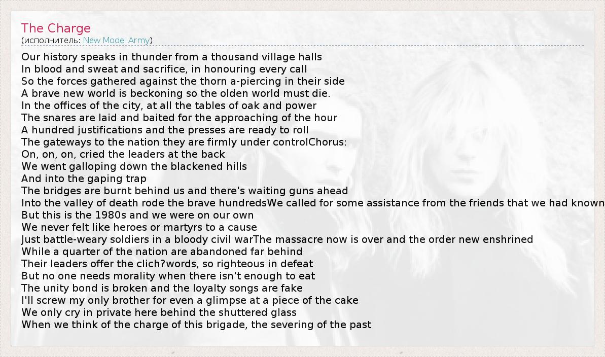Our history speaks in thunder from a thousand village halls In blood and sweat and sacrifice, in honouring every call So the forces gathered against the thorn a-piercing in their side A brave new world is beckoning so the olden world must die. In the offices of the city, at all the tables of oak and power The snares are laid and baited for the approaching of the hour A hundred justifications and the presses are ready to roll The gateways to the nation they are firmly under controlChorus: On, on, on, cried the leaders at the back We went galloping down the blackened hills And into the gaping trap The bridges are burnt behind us and there's waiting guns ahead Into the valley of death rode the brave hundredsWe called for some assistance from the friends that we had known But this is the 1980s and we were on our own We never felt like heroes or martyrs to a cause Just battle-weary soldiers in a bloody civil warThe massacre now is over and the order new enshrined While a quarter of the nation are abandoned far behind Their leaders offer the clich?words, so righteous in defeat But no one needs morality when there isn't enough to eat The unity bond is broken and the loyalty songs are fake I'll screw my only brother for even a glimpse at a piece of the cake We only cry in private here behind the shuttered glass When we think of the charge of this brigade, the severing of the past