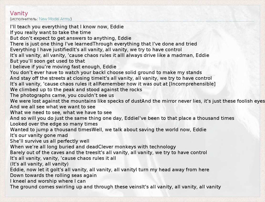 I'll teach you everything that I know now, Eddie If you really want to take the time But don't expect to get answers to anything, Eddie There is just one thing I've learnedThrough everything that I've done and tried Everything I have justifiedIt's all vanity, all vanity, we try to have control It's all vanity, all vanity, 'cause chaos rules it allI always drive like a madman, Eddie But you'll soon get used to that I believe if you're moving fast enough, Eddie You don't ever have to watch your backI choose solid ground to make my stands And stay off the streets at closing timeIt's all vanity, all vanity, we try to have control It's all vanity, 'cause chaos rules it allRemember how it was out at [Incomprehensible] We climbed up to the peak and stood against the rocks The photographs came, you couldn't see us We were lost against the mountains like specks of dustAnd the mirror never lies, it's just these foolish eyes And we all see what we want to see What we need to see, what we have to see And so will you do just the same thing one day, EddieI've been to that place a thousand times Looked over the edge so many times Wanted to jump a thousand timesWell, we talk about saving the world now, Eddie It's our vanity gone mad She'll survive us all perfectly well When we're all long buried and deadClever monkeys with technology Barely out of the caves and the treesIt's all vanity, all vanity, we try to have control It's all vanity, vanity, 'cause chaos rules it all (It's all vanity, all vanity) Eddie, now let it goIt's all vanity, all vanity, all vanityI turn my head away from here Down towards the rolling seas again I kneel and worship where I can The ground comes swirling up and through these veinsIt's all vanity, all vanity, all vanity