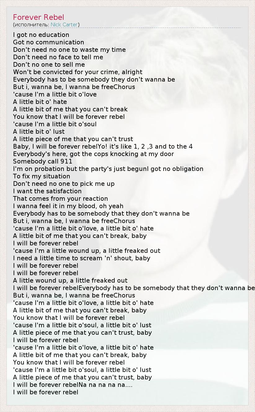 I got no education Got no communication Don't need no one to waste my time Don't need no face to tell me Don't no one to sell me Won't be convicted for your crime, alright Everybody has to be somebody they don't wanna be But i, wanna be, I wanna be freeChorus 'cause I'm a little bit o'love A little bit o' hate A little bit of me that you can't break You know that I will be forever rebel 'cause I'm a little bit o'soul A little bit o' lust A little piece of me that you can't trust Baby, I will be forever rebelYo! it's like 1, 2 ,3 and to the 4 Everybody's here, got the cops knocking at my door Somebody call 911 I'm on probation but the party's just begunI got no obligation To fix my situation Don't need no one to pick me up I want the satisfaction That comes from your reaction I wanna feel it in my blood, oh yeah Everybody has to be somebody that they don't wanna be But i, wanna be, I wanna be freeChorus 'cause I'm a little bit o'love, a little bit o' hate A little bit of me that you can't break, baby I will be forever rebel 'cause I'm a little wound up, a little freaked out I need a little time to scream 'n' shout, baby I will be forever rebel I will be forever rebel A little wound up, a little freaked out I will be forever rebelEverybody has to be somebody that they don't wanna be But i, wanna be, I wanna be freeChorus 'cause I'm a little bit o'love, a little bit o' hate A little bit of me that you can't break, baby You know that I will be forever rebel 'cause I'm a little bit o'soul, a little bit o' lust A little piece of me that you can't trust, baby I will be forever rebel 'cause I'm a little bit o'love, a little bit o' hate A little bit of me that you can't break, baby You know that I will be forever rebel 'cause I'm a little bit o'soul, a little bit o' lust A little piece of me that you can't trust, baby I will be forever rebelNa na na na na.... I will be forever rebel