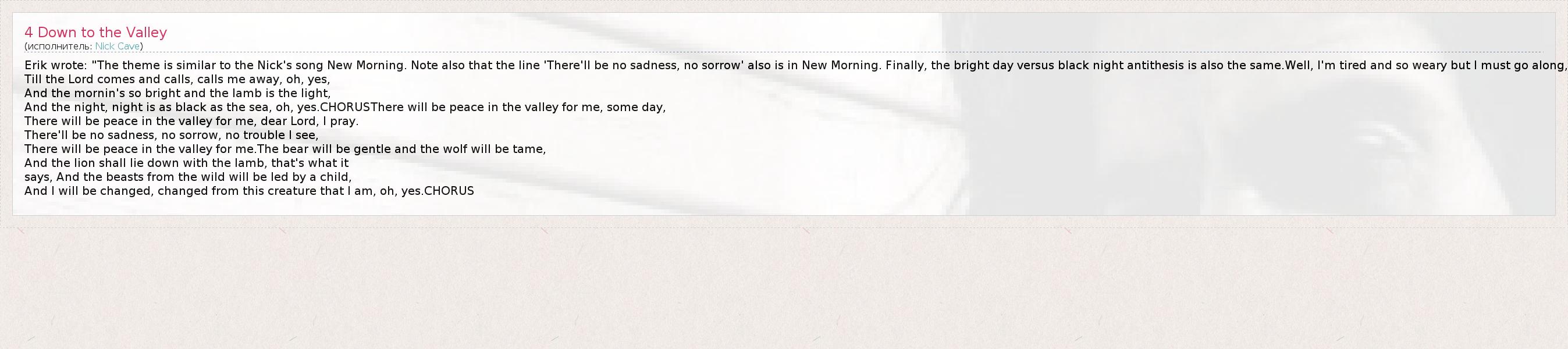 Erik wrote: "The theme is similar to the Nick's song New Morning. Note also that the line 'There'll be no sadness, no sorrow' also is in New Morning. Finally, the bright day versus black night antithesis is also the same.Well, I'm tired and so weary but I must go along,
