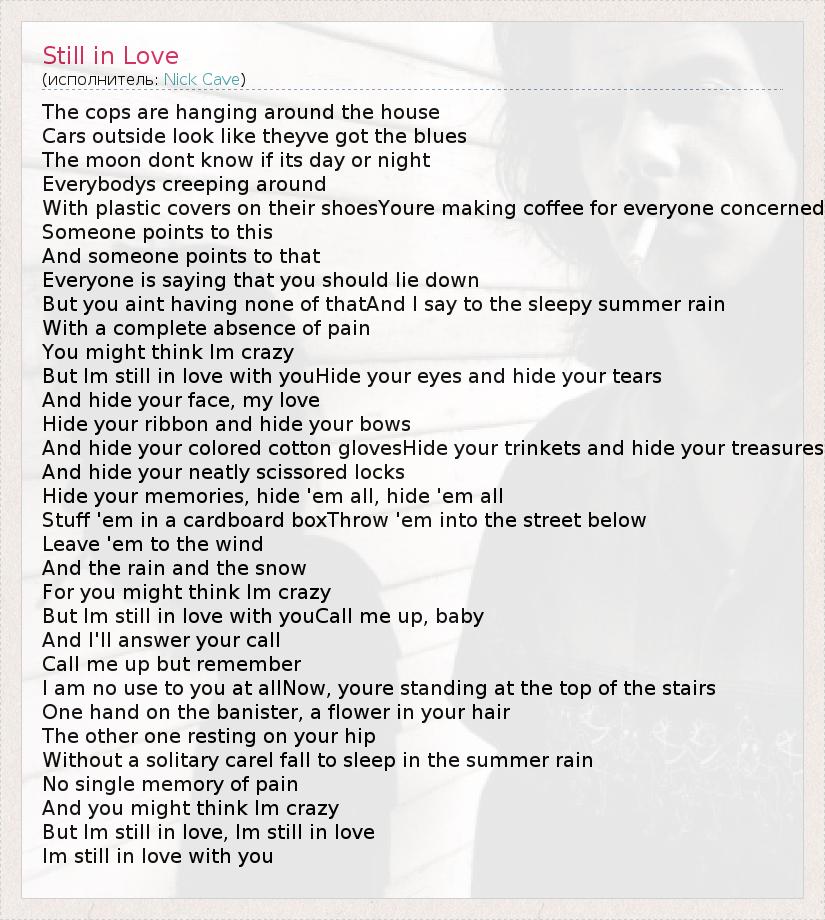 The cops are hanging around the house Cars outside look like theyve got the blues The moon dont know if its day or night Everybodys creeping around With plastic covers on their shoesYoure making coffee for everyone concerned Someone points to this And someone points to that Everyone is saying that you should lie down But you aint having none of thatAnd I say to the sleepy summer rain With a complete absence of pain You might think Im crazy But Im still in love with youHide your eyes and hide your tears And hide your face, my love Hide your ribbon and hide your bows And hide your colored cotton glovesHide your trinkets and hide your treasures And hide your neatly scissored locks Hide your memories, hide 'em all, hide 'em all Stuff 'em in a cardboard boxThrow 'em into the street below Leave 'em to the wind And the rain and the snow For you might think Im crazy But Im still in love with youCall me up, baby And I'll answer your call Call me up but remember I am no use to you at allNow, youre standing at the top of the stairs One hand on the banister, a flower in your hair The other one resting on your hip Without a solitary careI fall to sleep in the summer rain No single memory of pain And you might think Im crazy But Im still in love, Im still in love Im still in love with you