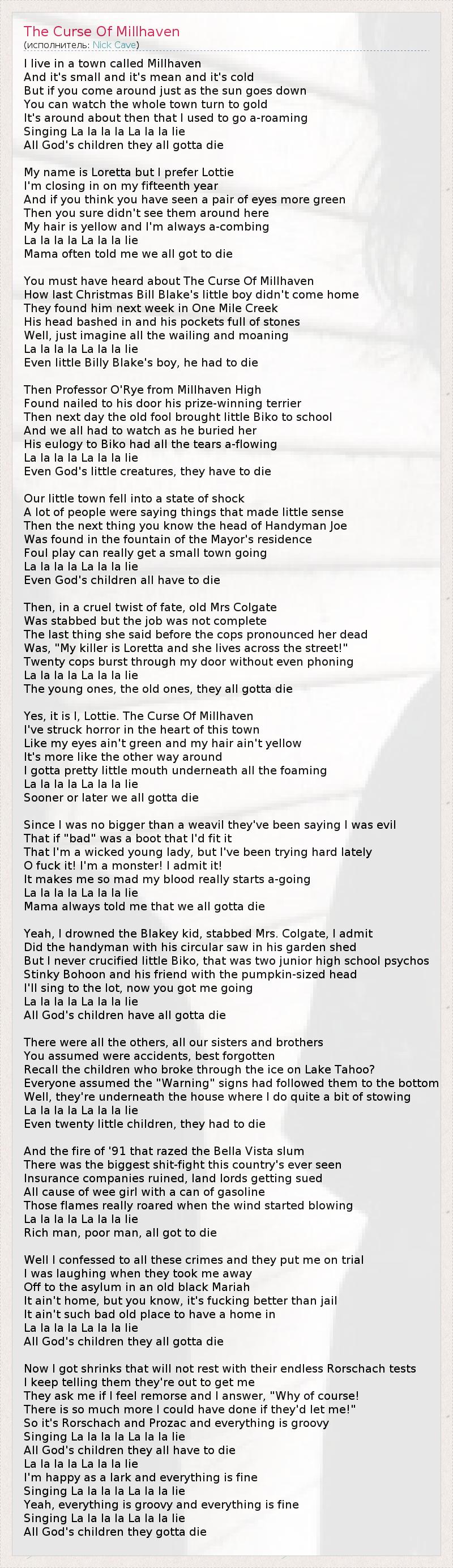 А как ты думаешь, о чем песня "The Curse Of Millhaven" ?