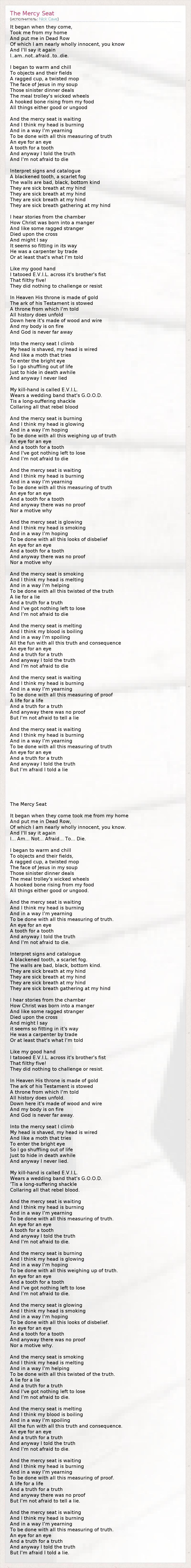 It began when they come, Took me from my home And put me in Dead Row Of which I am nearly wholly innocent, you know And I'll say it again I..am..not..afraid..to..die. I began to warm and chill To objects and their fields A ragged cup, a twisted mop The face of Jesus in my soup Those sinister dinner deals The meal trolley's wicked wheels A hooked bone rising from my food All things either good or ungood And the mercy seat is waiting And I think my head is burning And in a way I'm yearning To be done with all this measuring of truth An eye for an eye A tooth for a tooth And anyway I told the truth And I'm not afraid to die Interpret signs and catalogue A blackened tooth, a scarlet fog The walls are bad, black, bottom kind They are sick breath at my hind They are sick breath at my hind They are sick breath at my hind They are sick breath gathering at my hind I hear stories from the chamber How Christ was born into a manger And like some ragged stranger Died upon the cross And might I say It seems so fitting in its way He was a carpenter by trade Or at least that's what I'm told Like my good hand I tatooed E.V.I.L. across it's brother's fist That filthy five! They did nothing to challenge or resist In Heaven His throne is made of gold The ark of his Testament is stowed A throne from which I'm told All history does unfold Down here it's made of wood and wire And my body is on fire And God is never far away Into the mercy seat I climb My head is shaved, my head is wired And like a moth that tries To enter the bright eye So I go shuffling out of life Just to hide in death awhile And anyway I never lied My kill-hand is called E.V.I.L. Wears a wedding band that's G.O.O.D. Tis a long-suffering shackle Collaring all that rebel blood And the mercy seat is burning And I think my head is glowing And in a way I'm hoping To be done with all this weighing up of truth An eye for an eye And a tooth for a tooth And I've got nothing left to lose And I'm not afraid to die And the mercy seat is waiting And I think my head is burning And in a way I'm yearning To be done with all this measuring of truth An eye for an eye And a tooth for a tooth And anyway there was no proof Nor a motive why And the mercy seat is glowing And I think my head is smoking And in a way I'm hoping To be done with all this looks of disbelief An eye for an eye And a tooth for a tooth And anyway there was no proof Nor a motive why And the mercy seat is smoking And I think my head is melting And in a way I'm helping To be done with all this twisted of the truth A lie for a lie And a truth for a truth And I've got nothing left to lose And I'm not afraid to die And the mercy seat is melting And I think my blood is boiling And in a way I'm spoiling All the fun with all this truth and consequence An eye for an eye And a truth for a truth And anyway I told the truth And I'm not afraid to die And the mercy seat is waiting And I think my head is burning And in a way I'm yearning To be done with all this measuring of proof A life for a life And a truth for a truth And anyway there was no proof But I'm not afraid to tell a lie And the mercy seat is waiting And I think my head is burning And in a way I'm yearning To be done with all this measuring of truth An eye for an eye And a truth for a truth And anyway I told the truth But I'm afraid I told a lie The Mercy Seat It began when they come took me from my home And put me in Dead Row, Of which I am nearly wholly innocent, you know. And I'll say it again I... Am... Not... Afraid... To... Die. I began to warm and chill To objects and their fields, A ragged cup, a twisted mop The face of Jesus in my soup Those sinister dinner deals The meal trolley's wicked wheels A hooked bone rising from my food All things either good or ungood. And the mercy seat is waiting And I think my head is burning And in a way I'm yearning To be done with all this measuring of truth. An eye for an eye A tooth for a tooth And anyway I told the truth And I'm not afraid to die. Interpret signs and catalogue A blackened tooth, a scarlet fog. The walls are bad, black, bottom kind. They are sick breath at my hind They are sick breath at my hind They are sick breath at my hind They are sick breath gathering at my hind I hear stories from the chamber How Christ was born into a manger And like some ragged stranger Died upon the cross And might I say it seems so fitting in it's way He was a carpenter by trade Or at least that's what I'm told Like my good hand I tatooed E.V.I.L. across it's brother's fist That filthy five! They did nothing to challenge or resist. In Heaven His throne is made of gold The ark of his Testament is stowed A throne from which I'm told All history does unfold. Down here it's made of wood and wire And my body is on fire And God is never far away. Into the mercy seat I climb My head is shaved, my head is wired And like a moth that tries To enter the bright eye So I go shuffling out of life Just to hide in death awhile And anyway I never lied. My kill-hand is called E.V.I.L. Wears a wedding band that's G.O.O.D. 'Tis a long-suffering shackle Collaring all that rebel blood. And the mercy seat is waiting And I think my head is burning And in a way I'm yearning To be done with all this measuring of truth. An eye for an eye A tooth for a tooth And anyway I told the truth And I'm not afraid to die. And the mercy seat is burning And I think my head is glowing And in a way I'm hoping To be done with all this weighing up of truth. An eye for an eye And a tooth for a tooth And I've got nothing left to lose And I'm not afraid to die. And the mercy seat is glowing And I think my head is smoking And in a way I'm hoping To be done with all this looks of disbelief. An eye for an eye And a tooth for a tooth And anyway there was no proof Nor a motive why. And the mercy seat is smoking And I think my head is melting And in a way I'm helping To be done with all this twisted of the truth. A lie for a lie And a truth for a truth And 