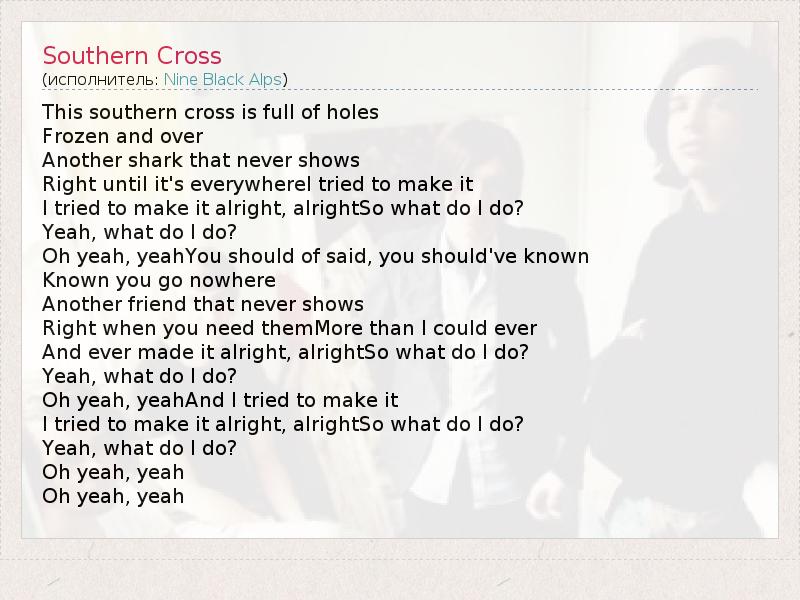 This southern cross is full of holes Frozen and over Another shark that never shows Right until it's everywhereI tried to make it I tried to make it alright, alrightSo what do I do? Yeah, what do I do? Oh yeah, yeahYou should of said, you should've known Known you go nowhere Another friend that never shows Right when you need themMore than I could ever And ever made it alright, alrightSo what do I do? Yeah, what do I do? Oh yeah, yeahAnd I tried to make it I tried to make it alright, alrightSo what do I do? Yeah, what do I do? Oh yeah, yeah Oh yeah, yeah