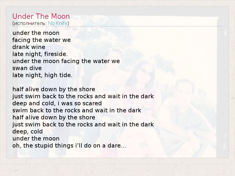 under the moon facing the water we drank wine late night, fireside. under the moon facing the water we swan dive late night, high tide. half alive down by the shore just swim back to the rocks and wait in the dark deep and cold, i was so scared swim back to the rocks and wait in the dark half alive down by the shore just swim back to the rocks and wait in the dark deep, cold under the moon oh, the stupid things i'll do on a dare...