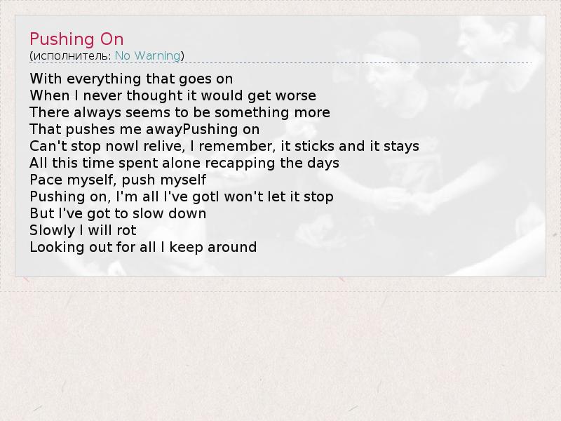 Это интересно:No Warning родом из Toronto, Canada.Группа была образована в 1998 под названием As We Once Were вокалистом Ben Cook и гитаристами Matt Delong и Jordan Posner.Они записали две дэмо записи и обе в '98 как As We Once Were.Группа впоследствии переименовала себя в No Warning.Их первый релиз под этим именем были три песни на демо-кассете.Они выпустили свою легендарную семёрку на Нью Йорковском лэйбле Martyr Records в 2001.В том же году Бостонский... продолжение