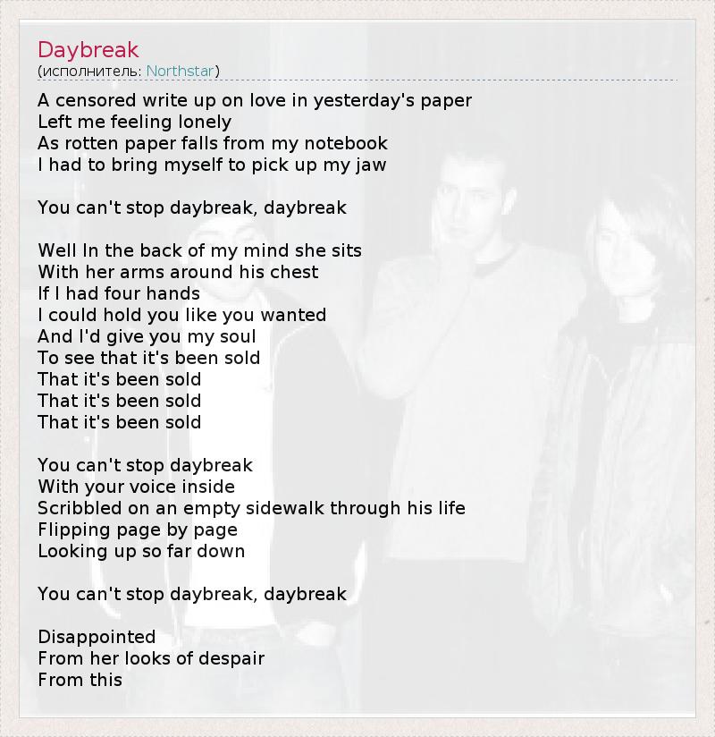 A censored write up on love in yesterday's paper Left me feeling lonely As rotten paper falls from my notebook I had to bring myself to pick up my jaw You can't stop daybreak, daybreak Well In the back of my mind she sits With her arms around his chest If I had four hands I could hold you like you wanted And I'd give you my soul To see that it's been sold That it's been sold That it's been sold That it's been sold You can't stop daybreak With your voice inside Scribbled on an empty sidewalk through his life Flipping page by page Looking up so far down You can't stop daybreak, daybreak Disappointed From her looks of despair From this