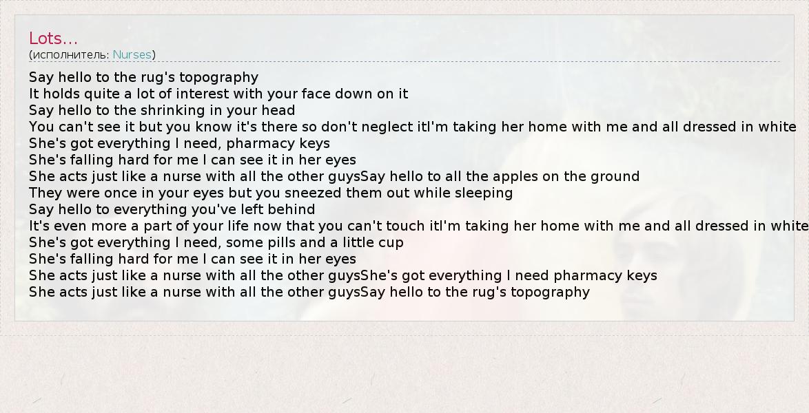 Say hello to the rug's topography It holds quite a lot of interest with your face down on it Say hello to the shrinking in your head You can't see it but you know it's there so don't neglect itI'm taking her home with me and all dressed in white She's got everything I need, pharmacy keys She's falling hard for me I can see it in her eyes She acts just like a nurse with all the other guysSay hello to all the apples on the ground They were once in your eyes but you sneezed them out while sleeping Say hello to everything you've left behind It's even more a part of your life now that you can't touch itI'm taking her home with me and all dressed in white She's got everything I need, some pills and a little cup She's falling hard for me I can see it in her eyes She acts just like a nurse with all the other guysShe's got everything I need pharmacy keys She acts just like a nurse with all the other guysSay hello to the rug's topography