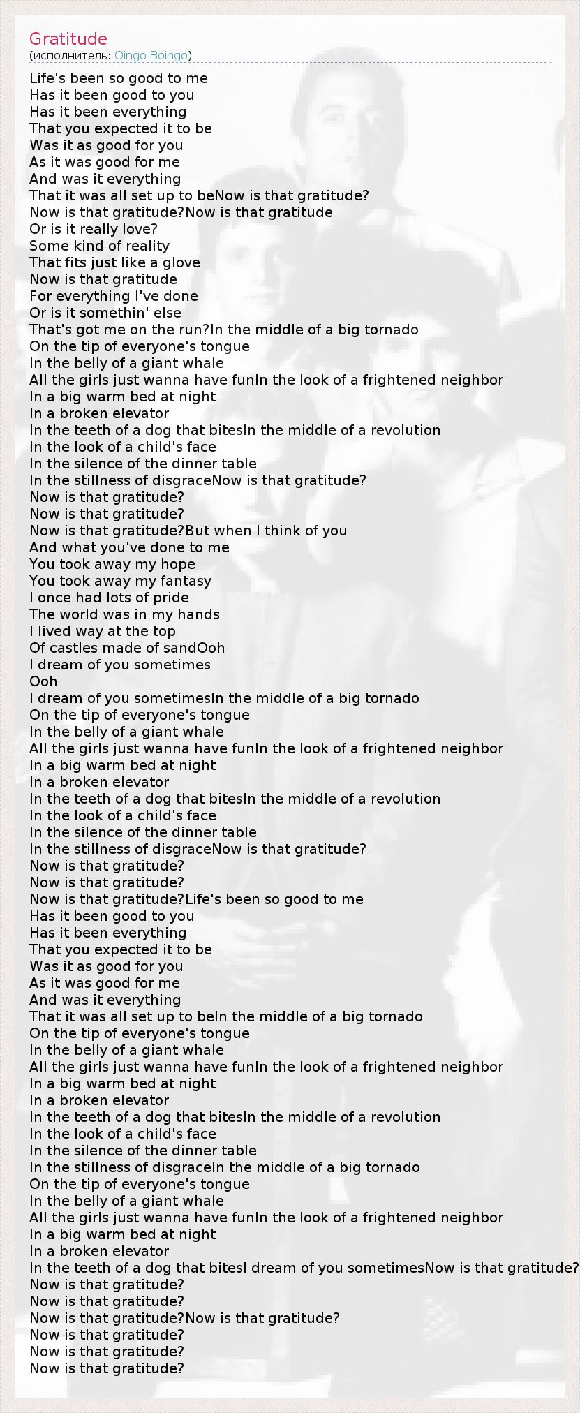 Life's been so good to me Has it been good to you Has it been everything That you expected it to be Was it as good for you As it was good for me And was it everything That it was all set up to beNow is that gratitude? Now is that gratitude?Now is that gratitude Or is it really love? Some kind of reality That fits just like a glove Now is that gratitude For everything I've done Or is it somethin' else That's got me on the run?In the middle of a big tornado On the tip of everyone's tongue In the belly of a giant whale All the girls just wanna have funIn the look of a frightened neighbor In a big warm bed at night In a broken elevator In the teeth of a dog that bitesIn the middle of a revolution In the look of a child's face In the silence of the dinner table In the stillness of disgraceNow is that gratitude? Now is that gratitude? Now is that gratitude? Now is that gratitude?But when I think of you And what you've done to me You took away my hope You took away my fantasy I once had lots of pride The world was in my hands I lived way at the top Of castles made of sandOoh I dream of you sometimes Ooh I dream of you sometimesIn the middle of a big tornado On the tip of everyone's tongue In the belly of a giant whale All the girls just wanna have funIn the look of a frightened neighbor In a big warm bed at night In a broken elevator In the teeth of a dog that bitesIn the middle of a revolution In the look of a child's face In the silence of the dinner table In the stillness of disgraceNow is that gratitude? Now is that gratitude? Now is that gratitude? Now is that gratitude?Life's been so good to me Has it been good to you Has it been everything That you expected it to be Was it as good for you As it was good for me And was it everything That it was all set up to beIn the middle of a big tornado On the tip of everyone's tongue In the belly of a giant whale All the girls just wanna have funIn the look of a frightened neighbor In a big warm bed at night In a broken elevator In the teeth of a dog that bitesIn the middle of a revolution In the look of a child's face In the silence of the dinner table In the stillness of disgraceIn the middle of a big tornado On the tip of everyone's tongue In the belly of a giant whale All the girls just wanna have funIn the look of a frightened neighbor In a big warm bed at night In a broken elevator In the teeth of a dog that bitesI dream of you sometimesNow is that gratitude? Now is that gratitude? Now is that gratitude? Now is that gratitude?Now is that gratitude? Now is that gratitude? Now is that gratitude? Now is that gratitude?