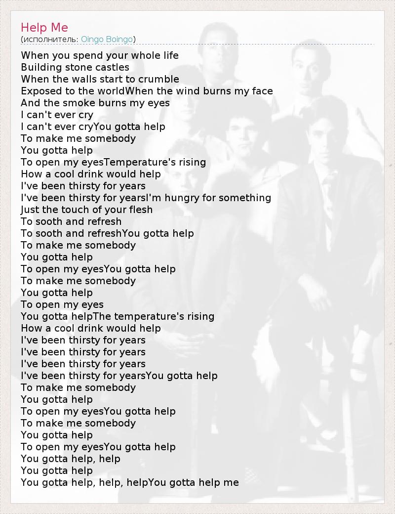 When you spend your whole life Building stone castles When the walls start to crumble Exposed to the worldWhen the wind burns my face And the smoke burns my eyes I can't ever cry I can't ever cryYou gotta help To make me somebody You gotta help To open my eyesTemperature's rising How a cool drink would help I've been thirsty for years I've been thirsty for yearsI'm hungry for something Just the touch of your flesh To sooth and refresh To sooth and refreshYou gotta help To make me somebody You gotta help To open my eyesYou gotta help To make me somebody You gotta help To open my eyes You gotta helpThe temperature's rising How a cool drink would help I've been thirsty for years I've been thirsty for years I've been thirsty for years I've been thirsty for yearsYou gotta help To make me somebody You gotta help To open my eyesYou gotta help To make me somebody You gotta help To open my eyesYou gotta help You gotta help, help You gotta help You gotta help, help, helpYou gotta help me