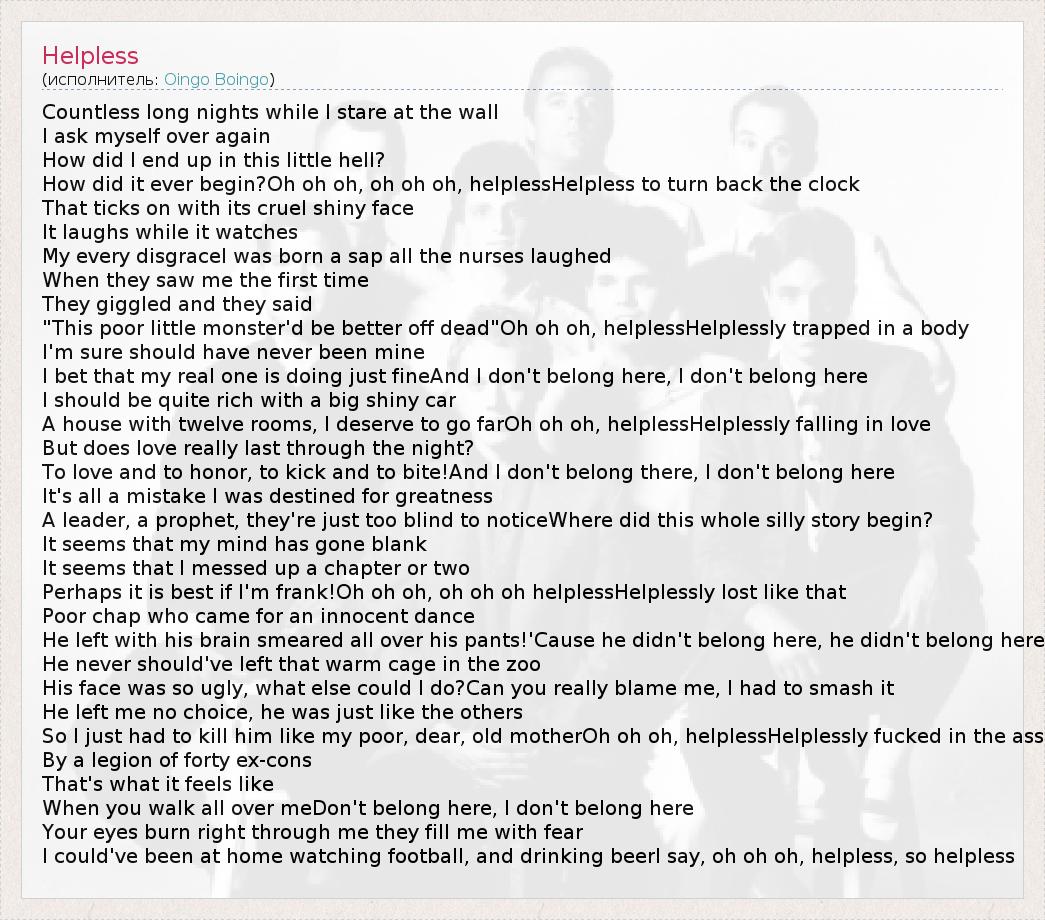 Countless long nights while I stare at the wall I ask myself over again How did I end up in this little hell? How did it ever begin?Oh oh oh, oh oh oh, helplessHelpless to turn back the clock That ticks on with its cruel shiny face It laughs while it watches My every disgraceI was born a sap all the nurses laughed When they saw me the first time They giggled and they said "This poor little monster'd be better off dead"Oh oh oh, helplessHelplessly trapped in a body I'm sure should have never been mine I bet that my real one is doing just fineAnd I don't belong here, I don't belong here I should be quite rich with a big shiny car A house with twelve rooms, I deserve to go farOh oh oh, helplessHelplessly falling in love But does love really last through the night? To love and to honor, to kick and to bite!And I don't belong there, I don't belong here It's all a mistake I was destined for greatness A leader, a prophet, they're just too blind to noticeWhere did this whole silly story begin? It seems that my mind has gone blank It seems that I messed up a chapter or two Perhaps it is best if I'm frank!Oh oh oh, oh oh oh helplessHelplessly lost like that Poor chap who came for an innocent dance He left with his brain smeared all over his pants!'Cause he didn't belong here, he didn't belong here He never should've left that warm cage in the zoo His face was so ugly, what else could I do?Can you really blame me, I had to smash it He left me no choice, he was just like the others So I just had to kill him like my poor, dear, old motherOh oh oh, helplessHelplessly fucked in the ass By a legion of forty ex-cons That's what it feels like When you walk all over meDon't belong here, I don't belong here Your eyes burn right through me they fill me with fear I could've been at home watching football, and drinking beerI say, oh oh oh, helpless, so helpless