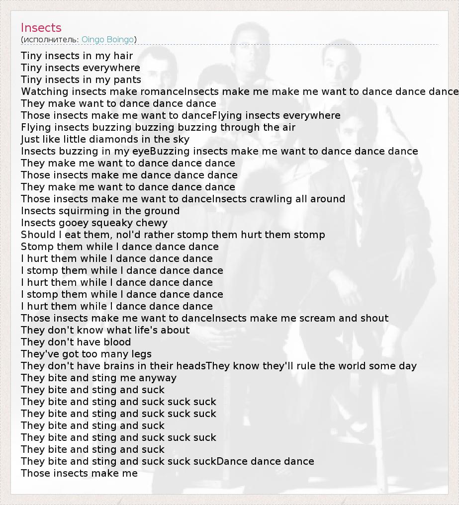 Tiny insects in my hair Tiny insects everywhere Tiny insects in my pants Watching insects make romanceInsects make me make me want to dance dance dance They make want to dance dance dance Those insects make me want to danceFlying insects everywhere Flying insects buzzing buzzing buzzing through the air Just like little diamonds in the sky Insects buzzing in my eyeBuzzing insects make me want to dance dance dance They make me want to dance dance dance Those insects make me dance dance dance They make me want to dance dance dance Those insects make me want to danceInsects crawling all around Insects squirming in the ground Insects gooey squeaky chewy Should I eat them, noI'd rather stomp them hurt them stomp Stomp them while I dance dance dance I hurt them while I dance dance dance I stomp them while I dance dance dance I hurt them while I dance dance dance I stomp them while I dance dance dance I hurt them while I dance dance dance Those insects make me want to danceInsects make me scream and shout They don't know what life's about They don't have blood They've got too many legs They don't have brains in their headsThey know they'll rule the world some day They bite and sting me anyway They bite and sting and suck They bite and sting and suck suck suck They bite and sting and suck suck suck They bite and sting and suck They bite and sting and suck suck suck They bite and sting and suck They bite and sting and suck suck suckDance dance dance Those insects make me
