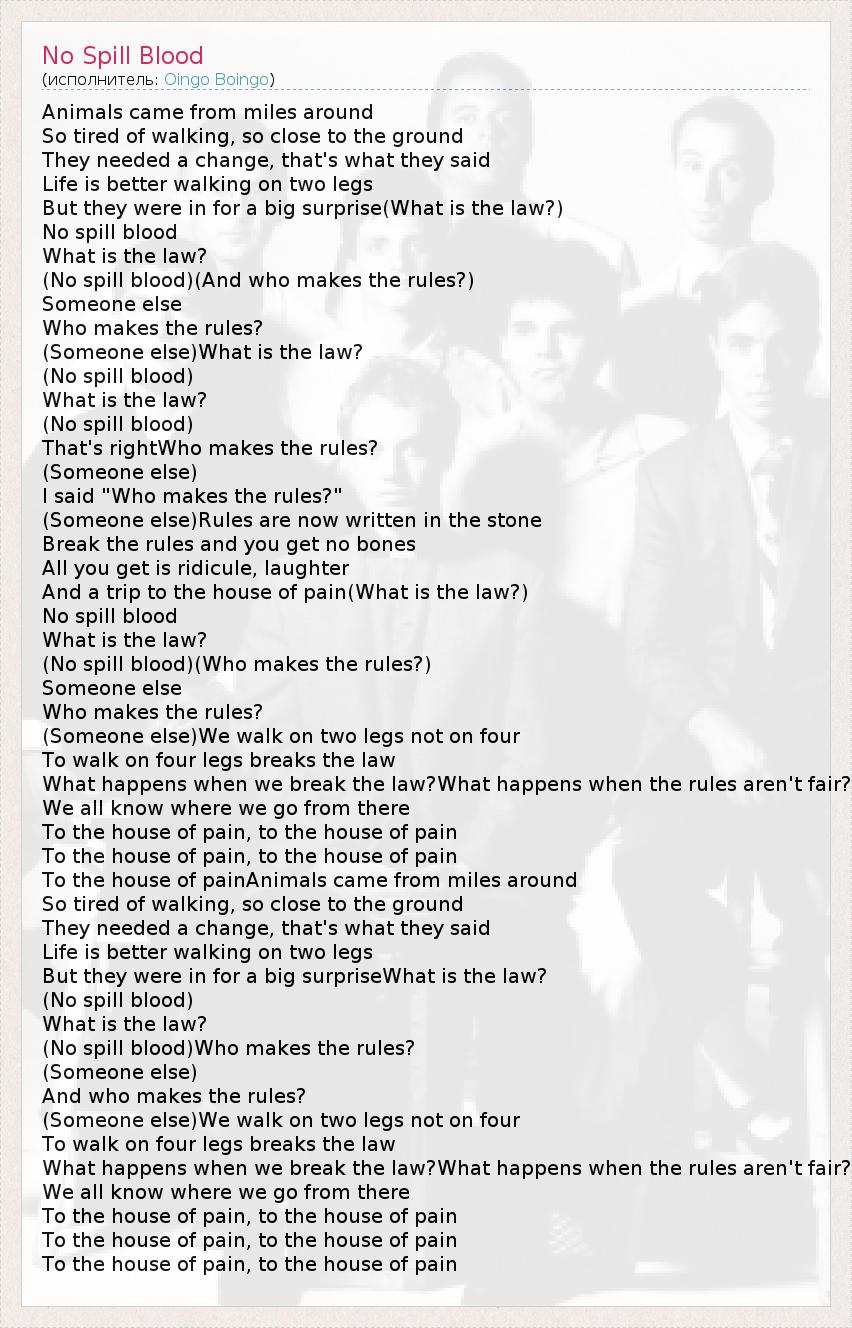Animals came from miles around So tired of walking, so close to the ground They needed a change, that's what they said Life is better walking on two legs But they were in for a big surprise(What is the law?) No spill blood What is the law? (No spill blood)(And who makes the rules?) Someone else Who makes the rules? (Someone else)What is the law? (No spill blood) What is the law? (No spill blood) That's rightWho makes the rules? (Someone else) I said "Who makes the rules?" (Someone else)Rules are now written in the stone Break the rules and you get no bones All you get is ridicule, laughter And a trip to the house of pain(What is the law?) No spill blood What is the law? (No spill blood)(Who makes the rules?) Someone else Who makes the rules? (Someone else)We walk on two legs not on four To walk on four legs breaks the law What happens when we break the law?What happens when the rules aren't fair? We all know where we go from there To the house of pain, to the house of pain To the house of pain, to the house of pain To the house of painAnimals came from miles around So tired of walking, so close to the ground They needed a change, that's what they said Life is better walking on two legs But they were in for a big surpriseWhat is the law? (No spill blood) What is the law? (No spill blood)Who makes the rules? (Someone else) And who makes the rules? (Someone else)We walk on two legs not on four To walk on four legs breaks the law What happens when we break the law?What happens when the rules aren't fair? We all know where we go from there To the house of pain, to the house of pain To the house of pain, to the house of pain To the house of pain, to the house of pain
