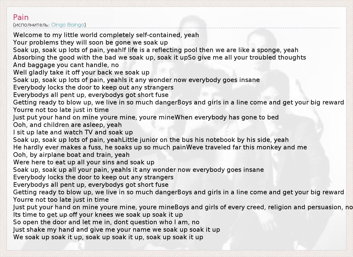 Soak up, soak up lots of pain, yeahIs it any wonder now everybody goes insane