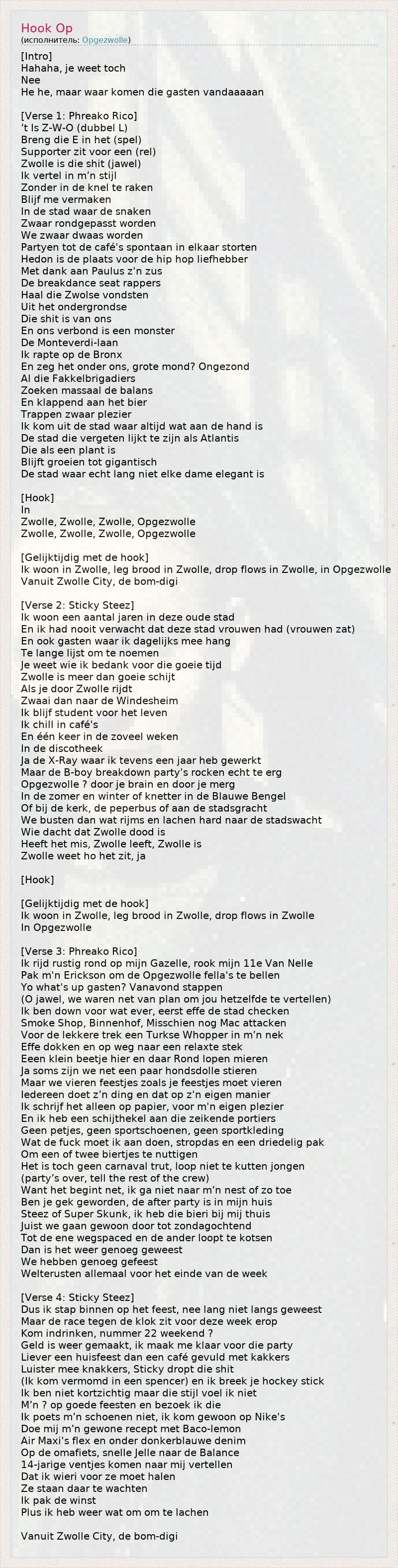 [Intro] Hahaha, je weet toch Nee He he, maar waar komen die gasten vandaaaaan [Verse 1: Phreako Rico] ’t Is Z-W-O (dubbel L) Breng die E in het (spel) Supporter zit voor een (rel) Zwolle is die shit (jawel) Ik vertel in m’n stijl Zonder in de knel te raken Blijf me vermaken In de stad waar de snaken Zwaar rondgepasst worden We zwaar dwaas worden Partyen tot de café's spontaan in elkaar storten Hedon is de plaats voor de hip hop liefhebber Met dank aan Paulus z'n zus De breakdance seat rappers Haal die Zwolse vondsten Uit het ondergrondse Die shit is van ons En ons verbond is een monster De Monteverdi-laan Ik rapte op de Bronx En zeg het onder ons, grote mond? Ongezond Al die Fakkelbrigadiers Zoeken massaal de balans En klappend aan het bier Trappen zwaar plezier Ik kom uit de stad waar altijd wat aan de hand is De stad die vergeten lijkt te zijn als Atlantis Die als een plant is Blijft groeien tot gigantisch De stad waar echt lang niet elke dame elegant is [Hook] In Zwolle, Zwolle, Zwolle, Opgezwolle Zwolle, Zwolle, Zwolle, Opgezwolle [Gelijktijdig met de hook] Ik woon in Zwolle, leg brood in Zwolle, drop flows in Zwolle, in Opgezwolle Vanuit Zwolle City, de bom-digi [Verse 2: Sticky Steez] Ik woon een aantal jaren in deze oude stad En ik had nooit verwacht dat deze stad vrouwen had (vrouwen zat) En ook gasten waar ik dagelijks mee hang Te lange lijst om te noemen Je weet wie ik bedank voor die goeie tijd Zwolle is meer dan goeie schijt Als je door Zwolle rijdt Zwaai dan naar de Windesheim Ik blijf student voor het leven Ik chill in café's En één keer in de zoveel weken In de discotheek Ja de X-Ray waar ik tevens een jaar heb gewerkt Maar de B-boy breakdown party's rocken echt te erg Opgezwolle ? door je brain en door je merg In de zomer en winter of knetter in de Blauwe Bengel Of bij de kerk, de peperbus of aan de stadsgracht We busten dan wat rijms en lachen hard naar de stadswacht Wie dacht dat Zwolle dood is Heeft het mis, Zwolle leeft, Zwolle is Zwolle weet ho het zit, ja [Hook] [Gelijktijdig met de hook] Ik woon in Zwolle, leg brood in Zwolle, drop flows in Zwolle In Opgezwolle [Verse 3: Phreako Rico] Ik rijd rustig rond op mijn Gazelle, rook mijn 11e Van Nelle Pak m'n Erickson om de Opgezwolle fella's te bellen Yo what's up gasten? Vanavond stappen (O jawel, we waren net van plan om jou hetzelfde te vertellen) Ik ben down voor wat ever, eerst effe de stad checken Smoke Shop, Binnenhof, Misschien nog Mac attacken Voor de lekkere trek een Turkse Whopper in m’n nek Effe dokken en op weg naar een relaxte stek Eeen klein beetje hier en daar Rond lopen mieren Ja soms zijn we net een paar hondsdolle stieren Maar we vieren feestjes zoals je feestjes moet vieren Iedereen doet z’n ding en dat op z'n eigen manier Ik schrijf het alleen op papier, voor m'n eigen plezier En ik heb een schijthekel aan die zeikende portiers Geen petjes, geen sportschoenen, geen sportkleding Wat de fuck moet ik aan doen, stropdas en een driedelig pak Om een of twee biertjes te nuttigen Het is toch geen carnaval trut, loop niet te kutten jongen (party’s over, tell the rest of the crew) Want het begint net, ik ga niet naar m’n nest of zo toe Ben je gek geworden, de after party is in mijn huis Steez of Super Skunk, ik heb die bieri bij mij thuis Juist we gaan gewoon door tot zondagochtend Tot de ene wegspaced en de ander loopt te kotsen Dan is het weer genoeg geweest We hebben genoeg gefeest Welterusten allemaal voor het einde van de week [Verse 4: Sticky Steez] Dus ik stap binnen op het feest, nee lang niet langs geweest Maar de race tegen de klok zit voor deze week erop Kom indrinken, nummer 22 weekend ? Geld is weer gemaakt, ik maak me klaar voor die party Liever een huisfeest dan een café gevuld met kakkers Luister mee knakkers, Sticky dropt die shit (Ik kom vermomd in een spencer) en ik breek je hockey stick Ik ben niet kortzichtig maar die stijl voel ik niet M’n ? op goede feesten en bezoek ik die Ik poets m’n schoenen niet, ik kom gewoon op Nike's Doe mij m’n gewone recept met Baco-lemon Air Maxi's flex en onder donkerblauwe denim Op de omafiets, snelle Jelle naar de Balance 14-jarige ventjes komen naar mij vertellen Dat ik wieri voor ze moet halen Ze staan daar te wachten Ik pak de winst Plus ik heb weer wat om om te lachen Vanuit Zwolle City, de bom-digi