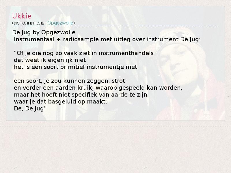 De Jug by Opgezwolle Instrumentaal + radiosample met uitleg over instrument De Jug: "Of je die nog zo vaak ziet in instrumenthandels dat weet ik eigenlijk niet het is een soort primitief instrumentje met een soort, je zou kunnen zeggen. strot en verder een aarden kruik, waarop gespeeld kan worden, maar het hoeft niet specifiek van aarde te zijn waar je dat basgeluid op maakt: De, De Jug"
