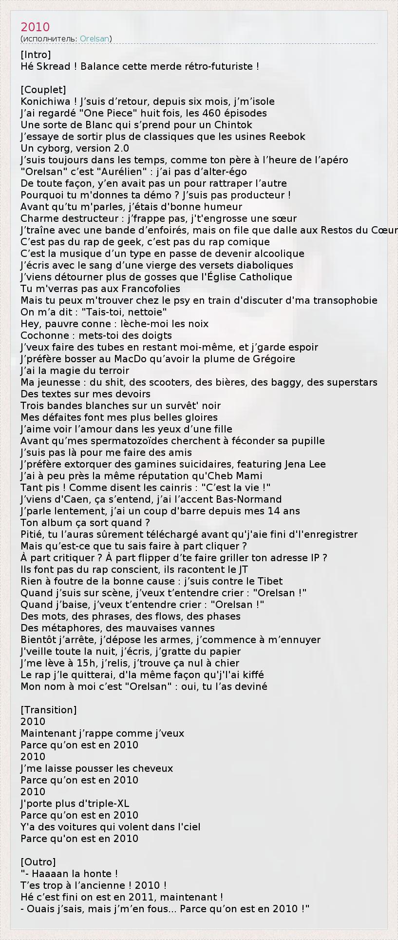 Это интересно:Orelsan, чье настоящее имя Аурелиан Cotentin, родился 1 августа 1982 года в Кане в кальвадос (Франция). Его родители учителя, и он должен следовать вывод, что исследования, получив степень бакалавра наук и несколько месяцев в школе управления. Вот как он будет удовлетворять Skread, производитель рэп-музыке. Этот доклад уже в культуре Orelsan в течение нескольких лет, и эта встреча станет дополнительным... продолжение