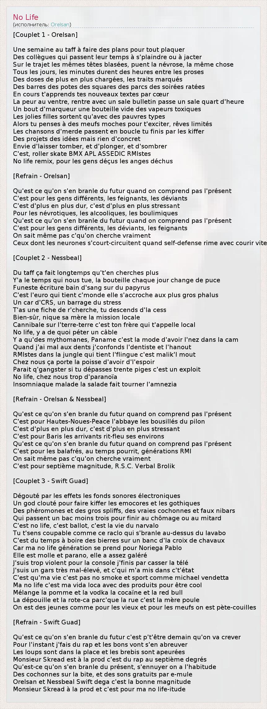 Это интересно:Orelsan, чье настоящее имя Аурелиан Cotentin, родился 1 августа 1982 года в Кане в кальвадос (Франция). Его родители учителя, и он должен следовать вывод, что исследования, получив степень бакалавра наук и несколько месяцев в школе управления. Вот как он будет удовлетворять Skread, производитель рэп-музыке. Этот доклад уже в культуре Orelsan в течение нескольких лет, и эта встреча станет дополнительным... продолжение