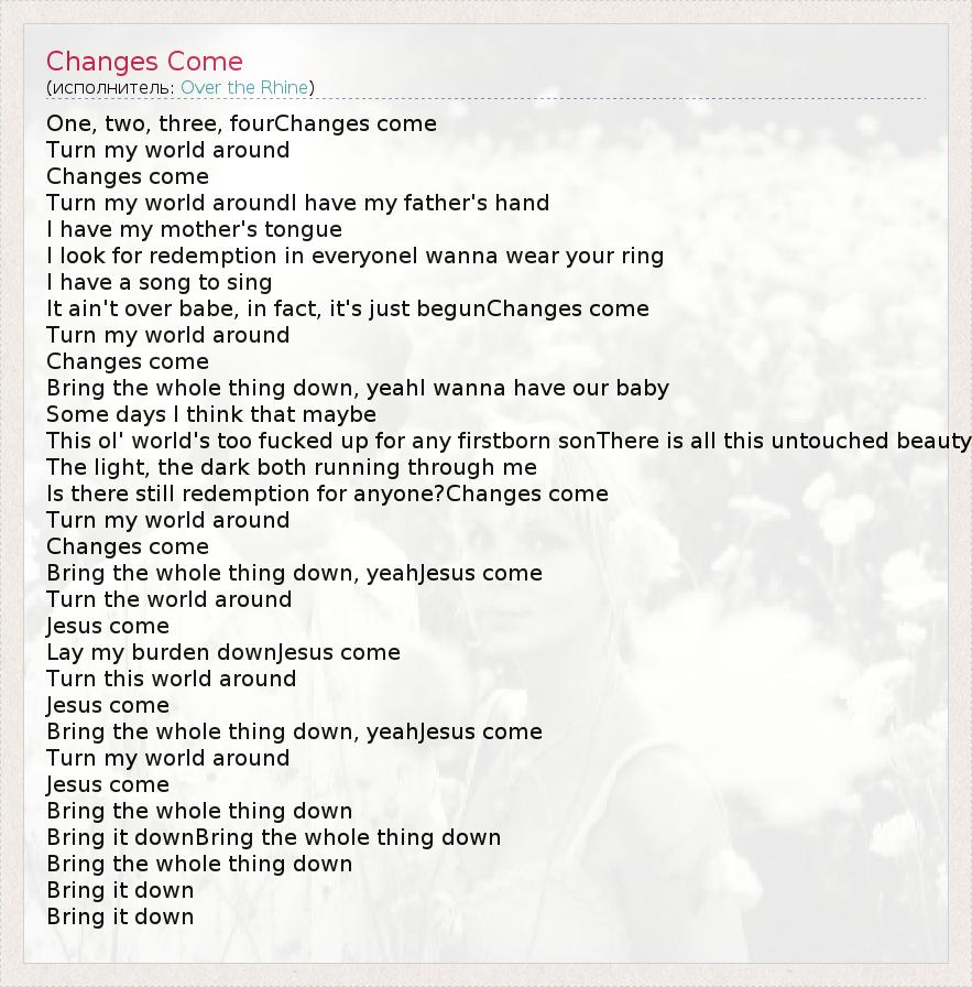One, two, three, fourChanges come Turn my world around Changes come Turn my world aroundI have my father's hand I have my mother's tongue I look for redemption in everyoneI wanna wear your ring I have a song to sing It ain't over babe, in fact, it's just begunChanges come Turn my world around Changes come Bring the whole thing down, yeahI wanna have our baby Some days I think that maybe This ol' world's too fucked up for any firstborn sonThere is all this untouched beauty The light, the dark both running through me Is there still redemption for anyone?Changes come Turn my world around Changes come Bring the whole thing down, yeahJesus come Turn the world around Jesus come Lay my burden downJesus come Turn this world around Jesus come Bring the whole thing down, yeahJesus come Turn my world around Jesus come Bring the whole thing down Bring it downBring the whole thing down Bring the whole thing down Bring it down Bring it down