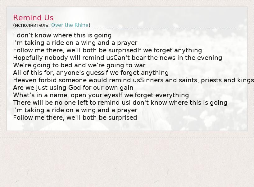 I don't know where this is going I'm taking a ride on a wing and a prayer Follow me there, we'll both be surprisedIf we forget anything Hopefully nobody will remind usCan't bear the news in the evening We're going to bed and we're going to war All of this for, anyone's guessIf we forget anything Heaven forbid someone would remind usSinners and saints, priests and kings Are we just using God for our own gain What's in a name, open your eyesIf we forget everything There will be no one left to remind usI don't know where this is going I'm taking a ride on a wing and a prayer Follow me there, we'll both be surprised