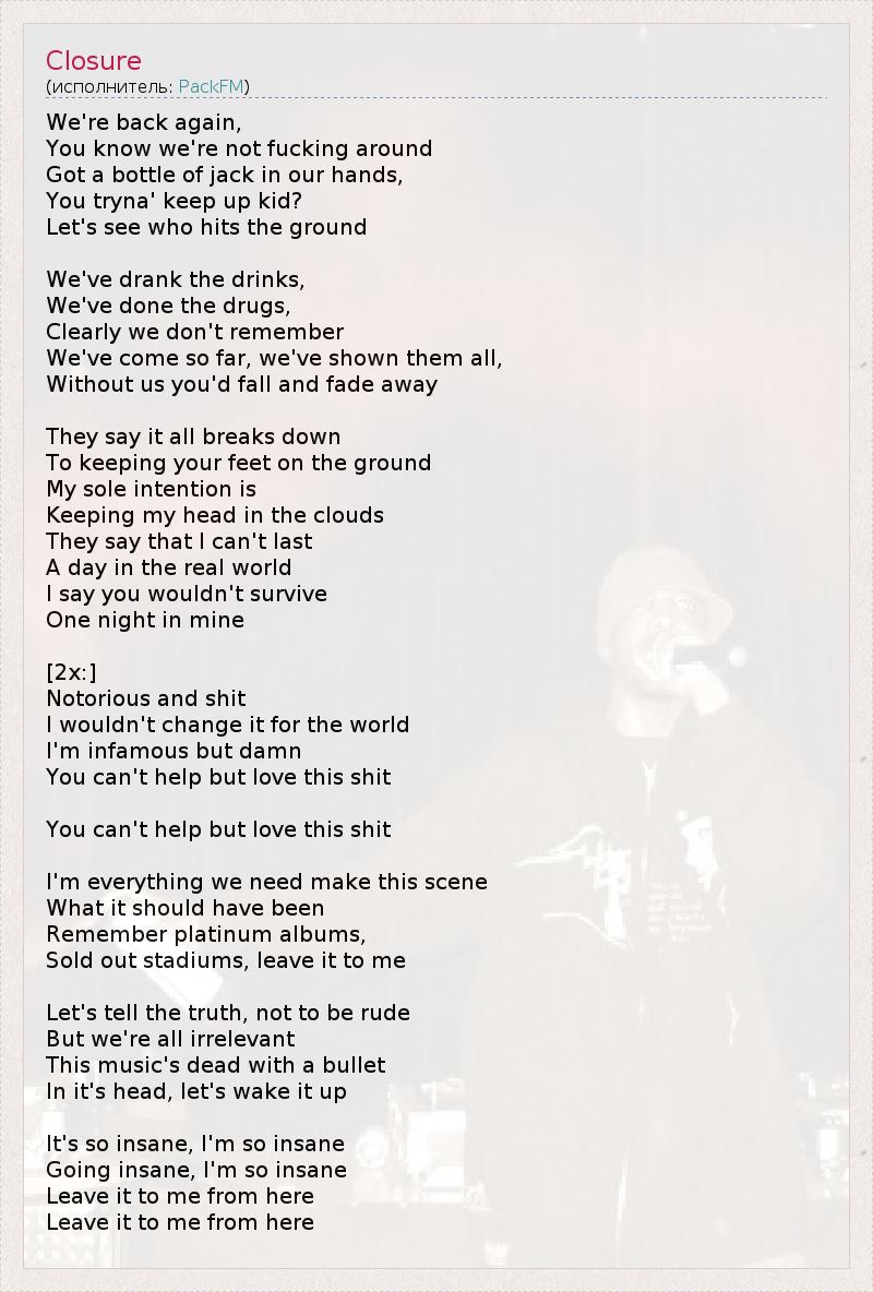 We're back again, You know we're not fucking around Got a bottle of jack in our hands, You tryna' keep up kid? Let's see who hits the ground We've drank the drinks, We've done the drugs, Clearly we don't remember We've come so far, we've shown them all, Without us you'd fall and fade away They say it all breaks down To keeping your feet on the ground My sole intention is Keeping my head in the clouds They say that I can't last A day in the real world I say you wouldn't survive One night in mine [2x:] Notorious and shit I wouldn't change it for the world I'm infamous but damn You can't help but love this shit You can't help but love this shit I'm everything we need make this scene What it should have been Remember platinum albums, Sold out stadiums, leave it to me Let's tell the truth, not to be rude But we're all irrelevant This music's dead with a bullet In it's head, let's wake it up It's so insane, I'm so insane Going insane, I'm so insane Leave it to me from here Leave it to me from here