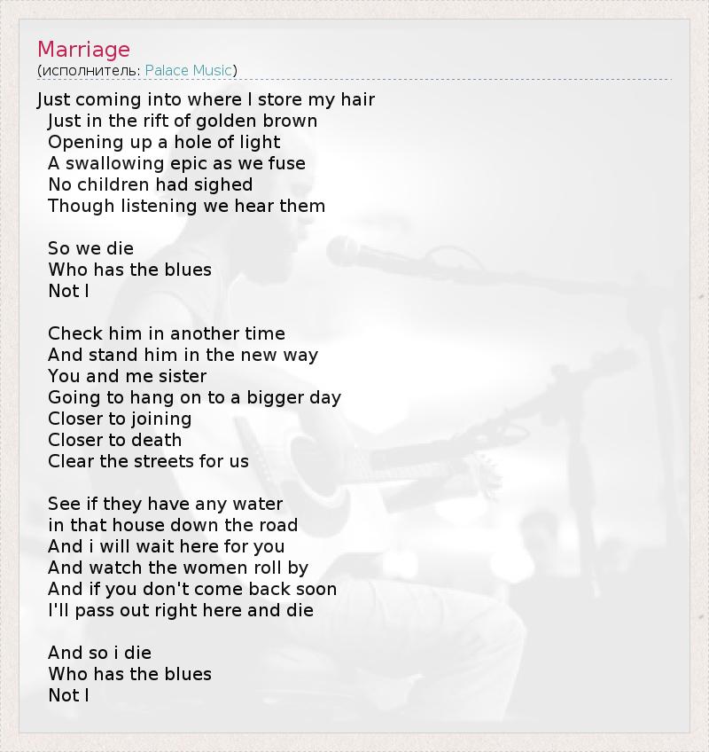 Just coming into where I store my hair Just in the rift of golden brown Opening up a hole of light A swallowing epic as we fuse No children had sighed Though listening we hear them So we die Who has the blues Not I Check him in another time And stand him in the new way You and me sister Going to hang on to a bigger day Closer to joining Closer to death Clear the streets for us See if they have any water in that house down the road And i will wait here for you And watch the women roll by And if you don't come back soon I'll pass out right here and die And so i die Who has the blues Not I