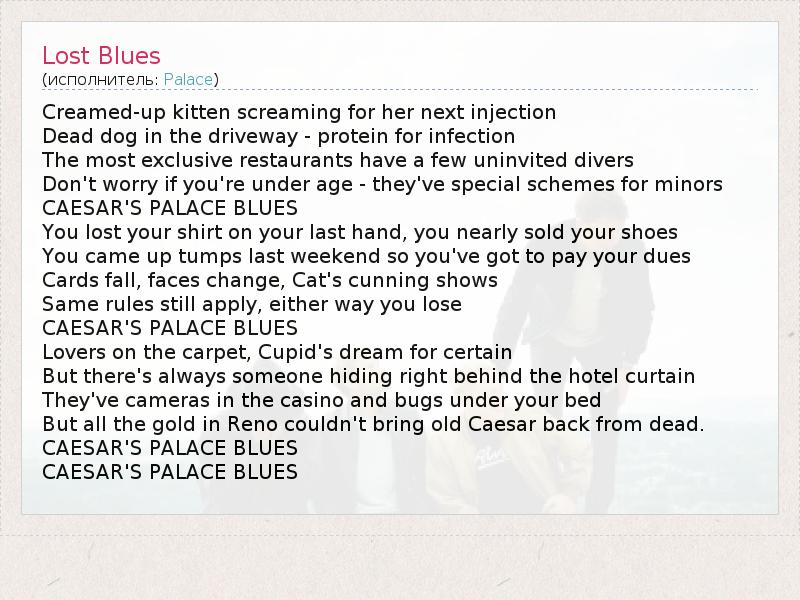 Creamed-up kitten screaming for her next injection Dead dog in the driveway - protein for infection The most exclusive restaurants have a few uninvited divers Don't worry if you're under age - they've special schemes for minors CAESAR'S PALACE BLUES You lost your shirt on your last hand, you nearly sold your shoes You came up tumps last weekend so you've got to pay your dues Cards fall, faces change, Cat's cunning shows Same rules still apply, either way you lose CAESAR'S PALACE BLUES Lovers on the carpet, Cupid's dream for certain But there's always someone hiding right behind the hotel curtain They've cameras in the casino and bugs under your bed But all the gold in Reno couldn't bring old Caesar back from dead. CAESAR'S PALACE BLUES CAESAR'S PALACE BLUES