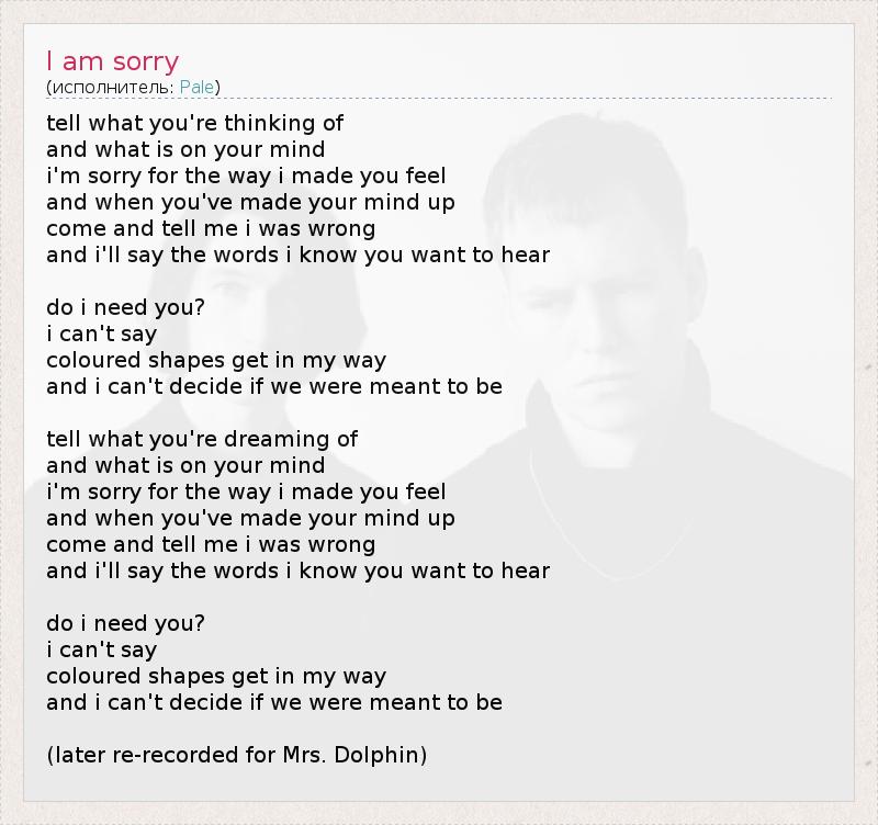 tell what you're thinking of and what is on your mind i'm sorry for the way i made you feel and when you've made your mind up come and tell me i was wrong and i'll say the words i know you want to hear do i need you? i can't say coloured shapes get in my way and i can't decide if we were meant to be tell what you're dreaming of and what is on your mind i'm sorry for the way i made you feel and when you've made your mind up come and tell me i was wrong and i'll say the words i know you want to hear do i need you? i can't say coloured shapes get in my way and i can't decide if we were meant to be (later re-recorded for Mrs. Dolphin)